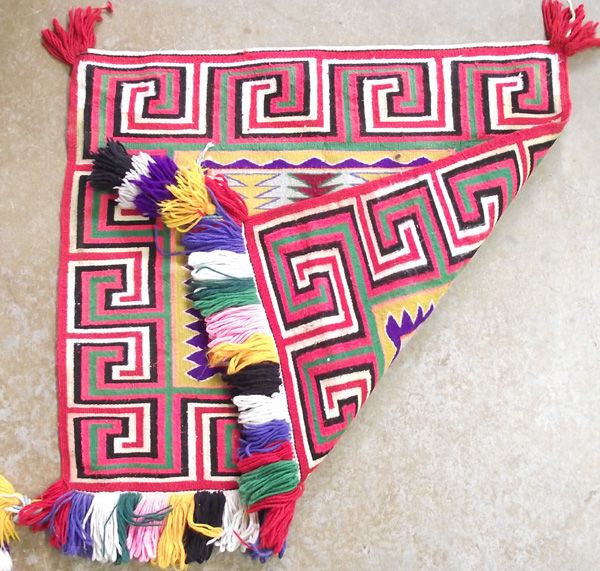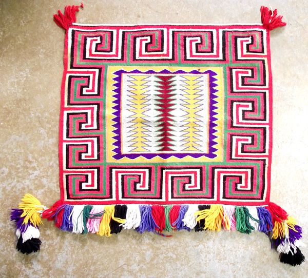 Teec Nos Pos Parade Single Side Saddle Blanket. An extraordinary parade blanket in vibrant colors and intricate design. Has the parade fringe on back end. Simply gorgeous blanket. It measures 33''W x 28''L with 4'' fringe and 10''L fringe corners on the back. Some staining which is hard to see and some bleeding of colors, but yarn is in good condition and overall appearance is nice.
