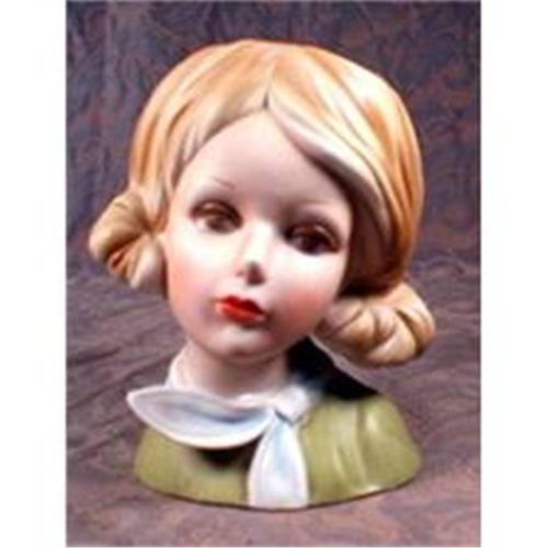 Inarco made a couple of different teen head vases with the model number E6211. This young lady has blond hair, a dreamy expression and a green dress with a bow at the neck. She's finished in matte colors.