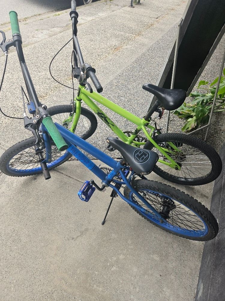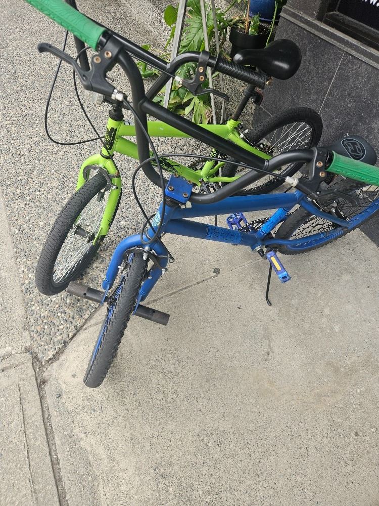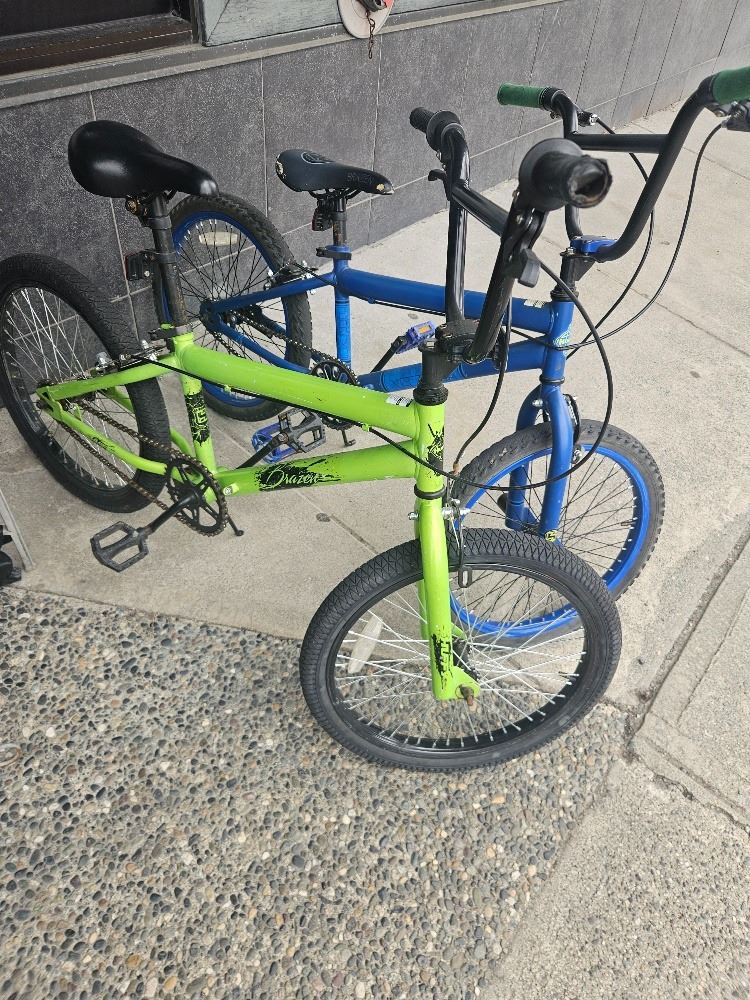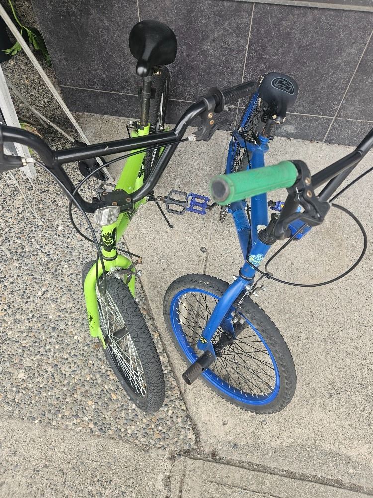 Set of two Huffy BMX bikes in vibrant green and blue. These rugged bikes feature freestyle frames, padded saddles, and stunt pegs—perfect for tricks or daily rides. Some signs of use, but ready for action!
