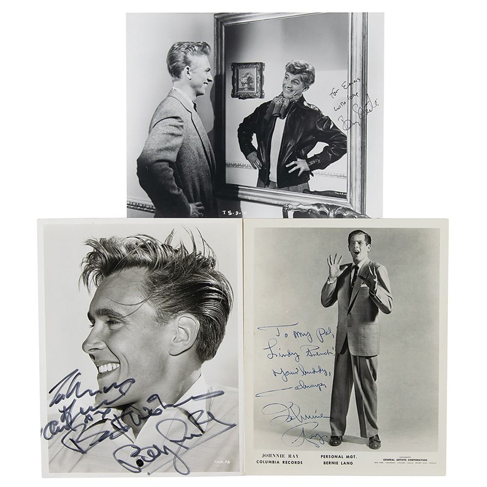 Three photos signed by teen idols: a vintage glossy 8 x 10 Columbia Records promo photo of American singer Johnnie Ray, signed and inscribed in fountain pen; a glossy 10 x 8 photo of English entertainer Tommy Steele, signed and inscribed in black felt tip; and a glossy 8 x 10 close-up photo of early English star Billy Fury, signed and inscribed in black felt tip. In overall very good to fine condition, with several minor creases to the Fury photo.