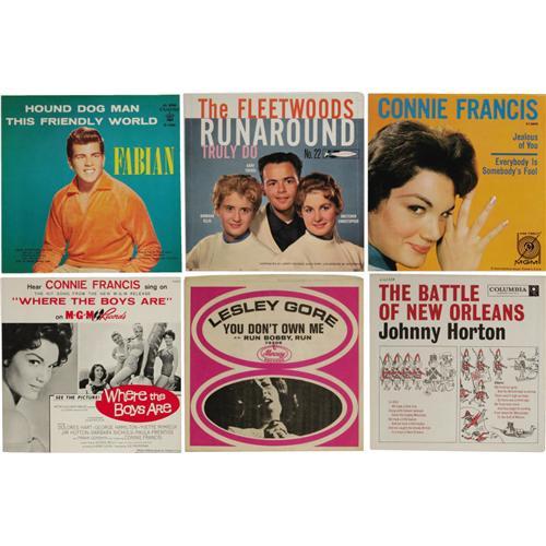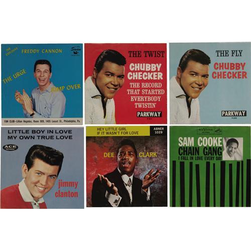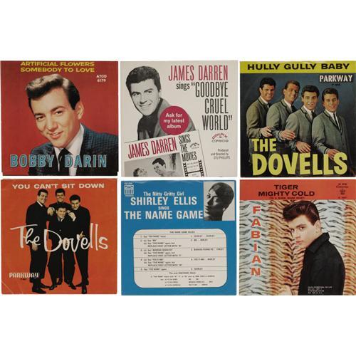 <B>Various Teen Idols Picture Sleeve Group of 34 (1957-66).</B></I> Highly satisfying picture sleeve group for even the most voracious picture sleeve appetite! It's an instant collection! Here are 34 goodie, all but a few prior to 1962. Note: no records, just the picture sleeves, and in an average condition of NM 8! Included are Freddy Cannon's "Way Down Yonder In New Orleans" (Swan 4043, 1959) in GM-MT 10 and "Jump Over" (Swan 4053, 1960) in NM 8; Chubby Checker's "The Twist" (Parkway 811, 1961) in NM 8 and "The Fly" (Parkway 830, 1961) in MT 9; Jimmy Clanton's "My Own True Love" (Ace 567, 1959) in MT 9; Dee Clark's "Hey Little Girl" (Abner 1029, 1959) in GM-MT 10; Sam Cooke's "Chain Gang" (RCA 7783, 1962) in NM 8; Johnny Crawford's "Your Nose Is Gonna Grow" (Delfi 4181, 1962) in NM 8; Bobby Darin's "Dream Lover" (Atco 6140, 1959) in MT 9, "Mack the Knife" (Atco 6147, 1959) in MT 9, "Beyond the Sea" (Atco 6158, 1959) in EX 7, "Clementine" (Atco 6161, 1959) in EX 7, "Bill Bailey" (Atco 6167, 1960) in MT 9, and "Artificial Flowers" (Atco 6179, 1960) in NM 8; James Darren's "Goodbye Cruel World" (Colpix 609, 1961) in NM 8; The Dovells' "Hully Gully Baby" (Parkway 845, 1963) in EX 7 and "You Can't Sit Down" (Parkway 867, 1963) in EX 7; Shirley Ellis' "The Name Game" (Congress 230, 1964) in EX 7; Fabian's "Tiger" (Chancellor 1037, 1959) in MT 9 and "Hound Dog Man" (Chancellor 1044, 1959) in MT 9; The Fleetwoods' "Runaround" (Dolton 22, 1959) in NM 8; Connie Francis' "Everybody Is Somebody's Fool" (MGM 12899, 1960) in MT 9 and "Where the Boys Are" (MGM 12971, 1961) in NM 8; Leslie Gore's "You Don't Own Me" (Mercury 72206, 1963) in NM 8; Johnny Horton's "The Battle of New Orleans" (Columbia 41339, 1959) in NM 8; Johnny & the Hurricanes' "Beatnik Fly" (Warwick 520, 1960) in MT 9; Brenda Lee's "I'm Sorry" (Decca 9-31093, 1960) in MT 9; Ricky Nelson's "Stood Up" (Imperial 5483, 1957) in NM 8, "Lonesome Town" (Imperial 5545, 1958) in MT 9, and "I Wanna Be Loved" (Imperial 5614, 1959) in MT 9; Ray Peterson's "Corinna, Corinna" (Dunes 2002, 1960) in NM 8; Paul Revere and the Raiders' "Good Thing" (Columbia 43907, 1966) in MT 9; The Righteous Brothers "Just Once In My Life" (Philles 127, 1965) in NM 8; and The Supremes' "Back In My Arms Again" (Motown 1075, 1965) in MT 9. <I>From the GRT Collection</B></I>.<BR><BR><b>Shipping:</b> Recordings (<a target="_blank" href="http://www.heritageauctions.com/common/shipping.php">view shipping information</a>)