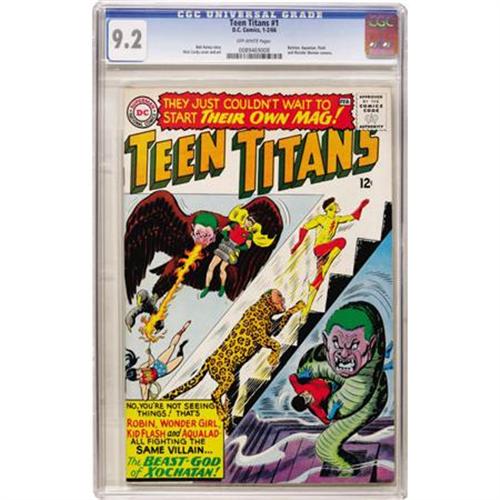 <B>Teen Titans #1 (DC, 1966) CGC NM- 9.2 Off-white pages.</B></I> After a couple of tryout appearances in <B>The Brave and the Bold</B></I> and one in <B>Showcase</B></I>, the Titans were given their own mag (there's no #1 on the cover as that was considered a negative back in the day). Batman, Flash, Wonder Woman, and Aquaman appear in cameos. Nick Cardy drew the cover and illustrated Bob Haney's story. Overstreet 2007 NM- 9.2 value = $485. CGC census 5/07: 6 in 9.2, 7 higher. <I> From the Keith Marlow Collection.</B></I><BR><BR><b>Shipping:</b> Comics - Slabbed (certified) (<a target="_blank" href="http://www.heritageauctions.com/common/shipping.php">view shipping information</a>)