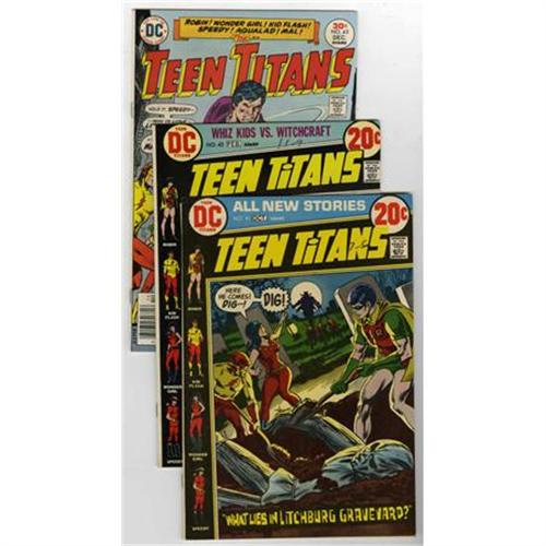 <B>Teen Titans Group (DC, 1972-78) Condition: Average VF/NM.</B></I> Includes #41 (1" tear on the front cover - FN), 43, 45, #46 (Joker's daughter begins), 49, 51, 52 (2 copies), and #53 (origin retold). Approximate Overstreet value for group = $150. <I> From the Madison Monk Collection.</B></I><BR><BR><b>Shipping:</b> Comics - Unslabbed (<a target="_blank" href="http://www.heritageauctions.com/common/shipping.php">view shipping information</a>)