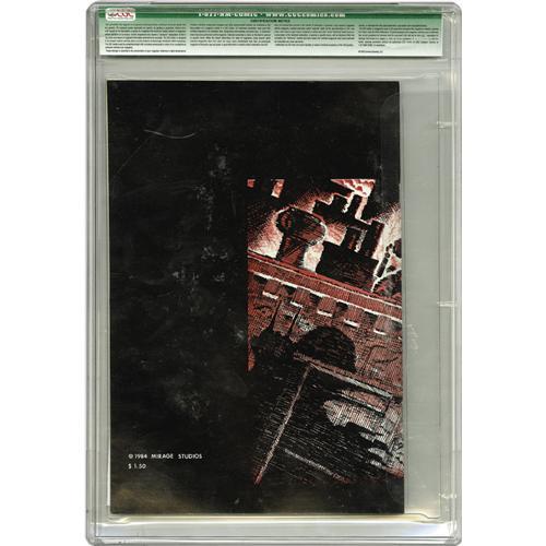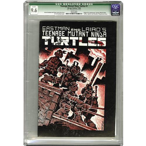 <B>Teenage Mutant Ninja Turtles #1 (Mirage Studios, 1984) CGC Qualified NM+ 9.6 White pages.</B></I> First printings like this one were already a high-demand item in the mid-80s, and anyone who thought that was a passing fad turned out to be dead wrong! In fact, this currently stands as the most valuable 1980s comic book. While the series that <B>TMNT</B></I> parodies, Frank Miller's <B>Ronin</B></I>, was hoarded in immense quantities upon publication, this under-the-radar independent comic was bought by only a select few (the print run was just 3,000). This is the origin and first appearance of the Teenage Mutant Ninja Turtles, Splinter, and Shredder. Kevin Eastman and Peter Laird handled the story and art. Note that Overstreet does not list a value for the first printing. CGC notes, "3-inch tear on 8th and 9th page."