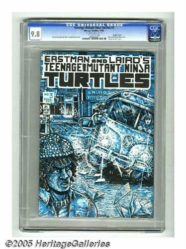 <B>Teenage Mutant Ninja Turtles #3 Double Cover (Mirage Studios, 1985) CGC NM/MT 9.8 Off-white pages.</B></I> Kevin Eastman and Peter Laird story and art. CGC notes, "1st cover 9.0, interior cover 9.8." Overstreet 2005 NM- 9.2 value = $50. CGC census 1/05: 7 in 9.8, none higher. <I>From the collection of Chris Bell.</B></I>