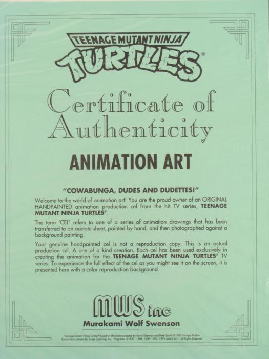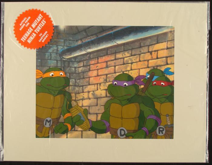 This is an original animation production cel from the 1980's television series Teenage Mutant Ninja Turtles. The cel shows 4 turtles with a gadget.Medium: Hand painted image on acetate celMatting: Beige matteImage area: 7 3/4" x 9 1/2 inches Matte size: 11" x 14" Included: Certificate of Authenticity from Murakami Wolf SwensonCondition: ExcellentHey dudes, this is an authentic cel seen in cartoons, and now's your chance to make it yours!