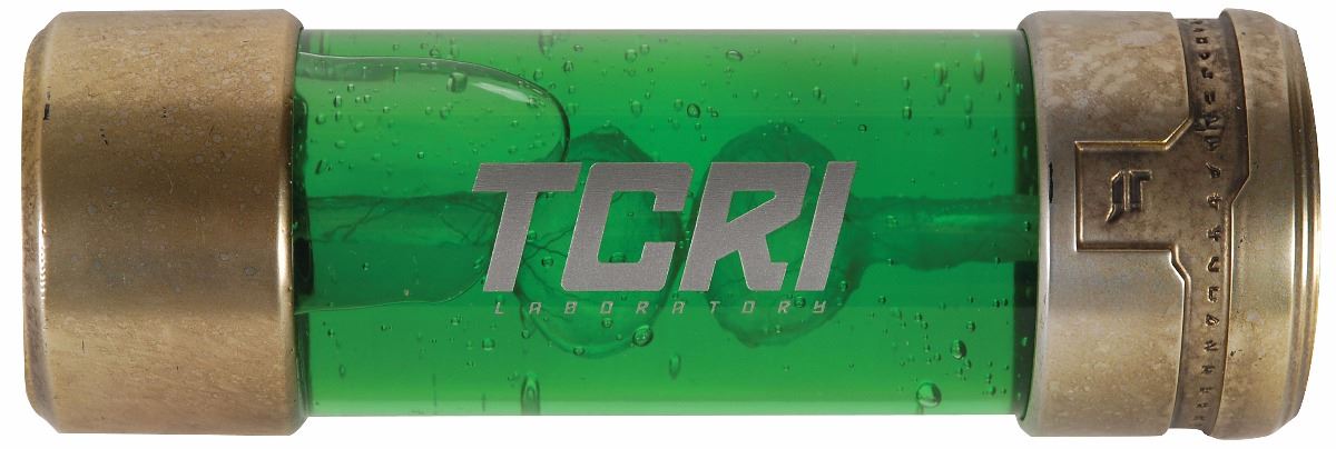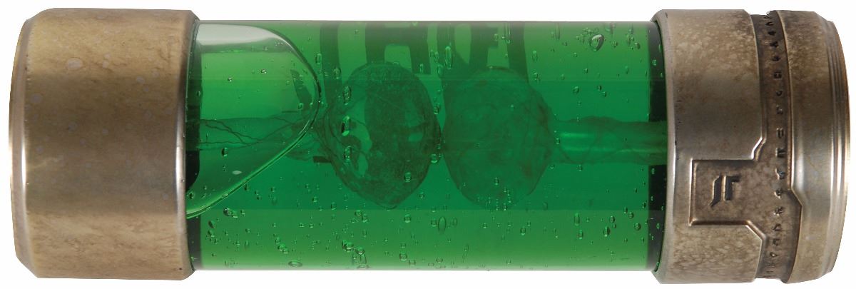Awesome ooze canister prop from the 2014 film Teenage Mutant Ninja Turtles, standing 8? tall, with faded faux-metal caps at each end, the top bearing arcane symbols. The vial itself is filled with viscous bright green slime and a pair of eyeball-like globules, with lettering imprinted on the side of the tube, “TCRI Laboratory.” In fine condition.