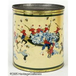 <B>Teenie Weenie Toffies Tin and Ad (Reid, Murdoch & Co., 1928).</B></I> William Donahey's dimunitive Teenie Weenies defend their toffies from an invasion of honeybees, on this delectable Teenie Weenie Toffies tin from 1928. Produced by Reid, Murdoch & Co, this tin measures 12".5 wide by 14.5" tall. Imprinted on one side is the Monarch Teenie Weenie Toffies logo and on the other side the General urges his men on as they battle the bees in a beautiful, full-color scenario. There are some small rust spots on the tin edges, otherwise the tin is in Very Good condition. This lot includes a full-page, full-color original Teenie Weenie ad that was printed in the <B>Ladies' Home Journal</B></I> in March, 1928. 2 items