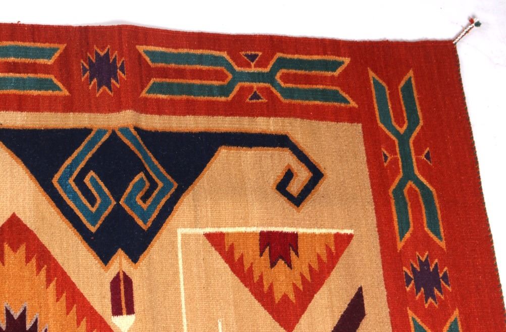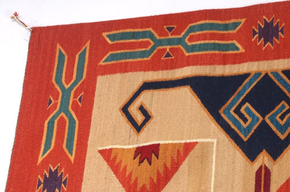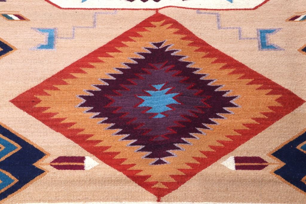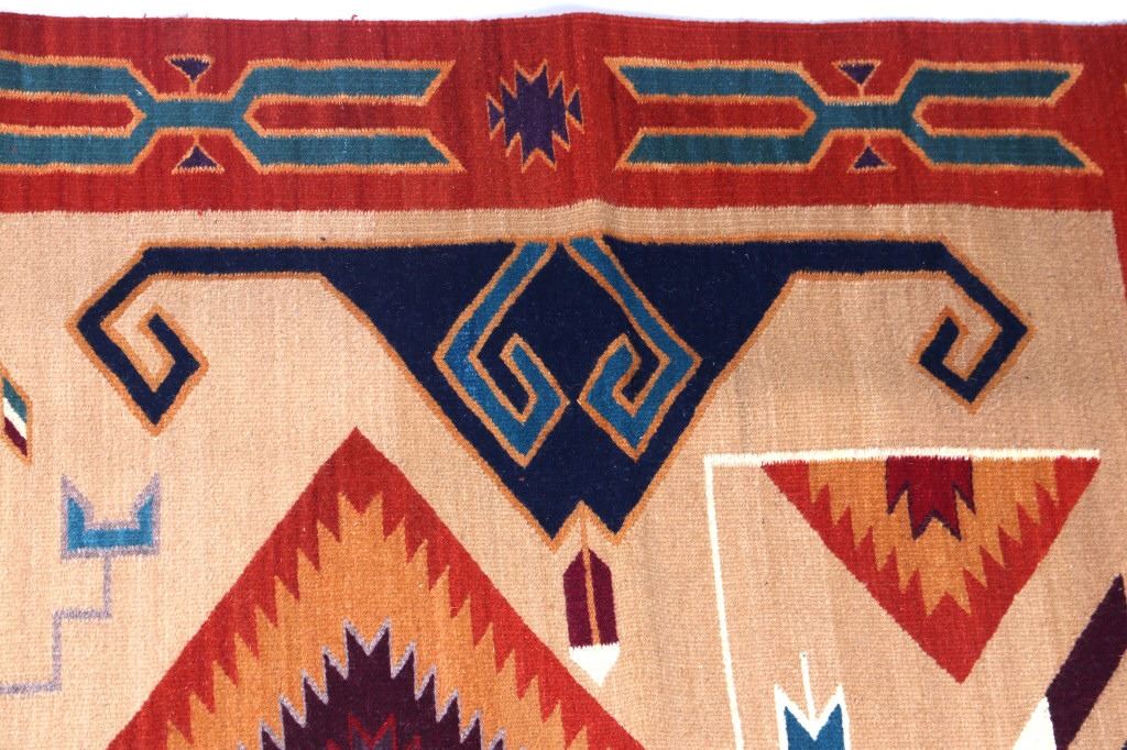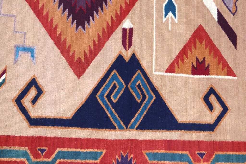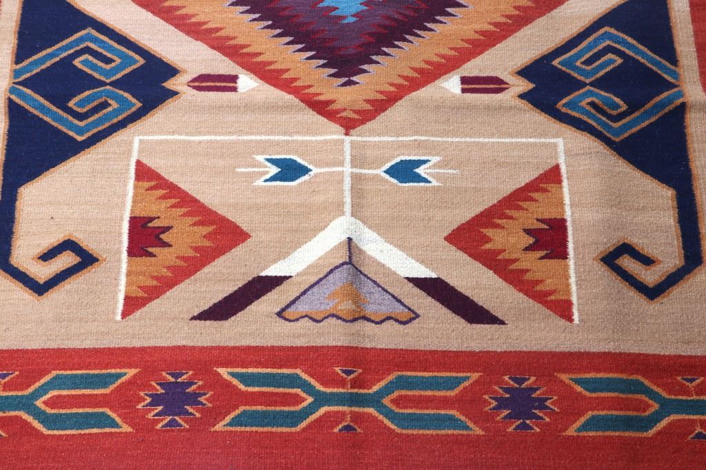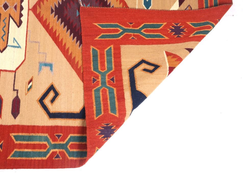 This is an excellent handwoven flat weave large rug by master weaver Enrique Ruiz using 100% soft fine handspun wool in an outstanding Tees Miel pattern. The rug was handwoven with a tight weave using 100% locally handspun wool yarn that offers natural variegation and durability with color fast aniline dyes. Tight handwoven weave displayed with bold colors in the extremely detailed Tees Miel pattern in the time-honored Zapotec multi-generational craft by a master weaver, Enrique Ruiz. This bold and beautiful rug shows a fantastic marriage between traditions, showing a rich Navajo Teec Nos Pos styling with a Zapotec Oaxaca Indian bright color and immensely detailed flair. This example shows a heathered tan background with traditional Tees emblems infused with lively coloration having a decorative bold border. The piece is in brand new condition with fine tight weave and unique multi-colored braided ends. The nice large rug measures 5’ by 8’ (5 foot by 8 foot). This is a contemporary rug hand woven by Enrique Ruiz, a Zapotec Indian from a small weaving village, in amazing natural dyes and wool showing a nice large size.