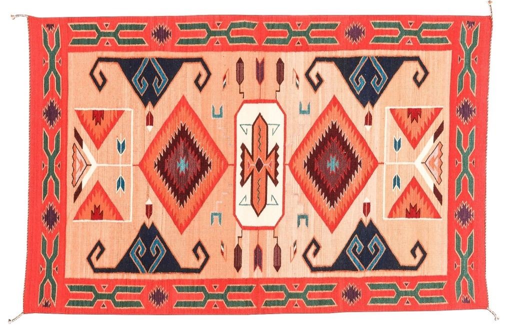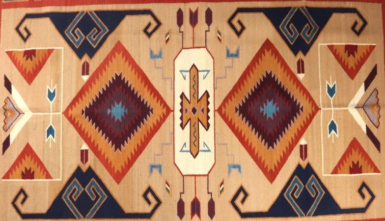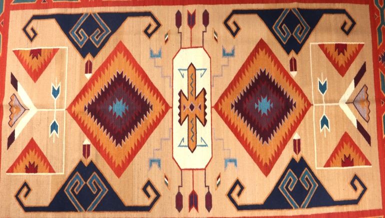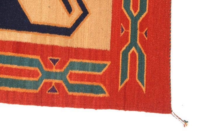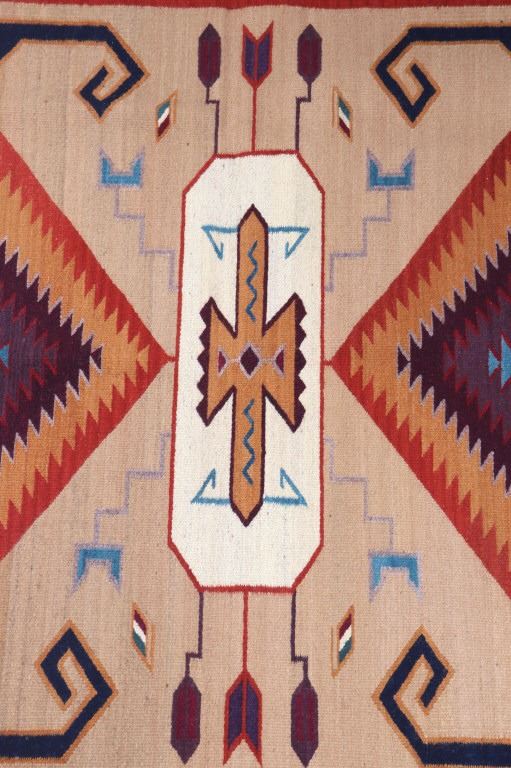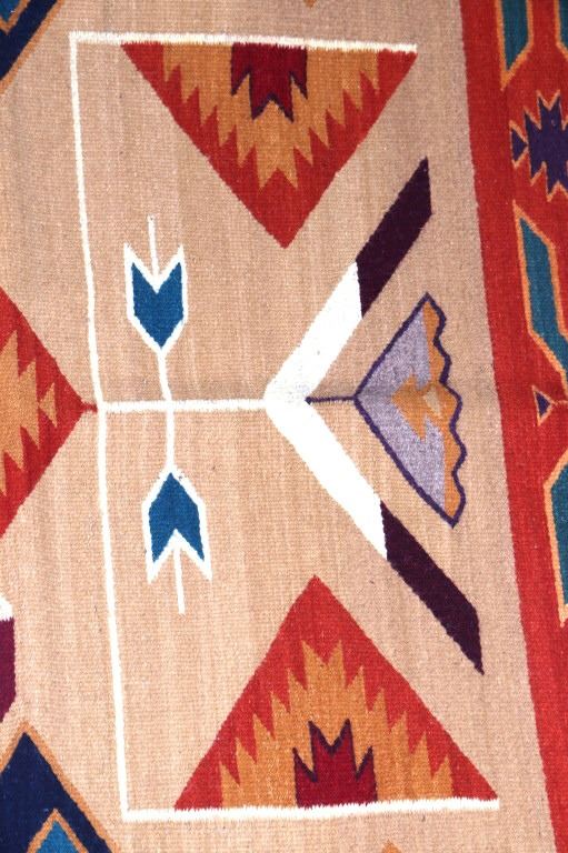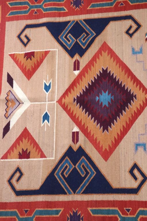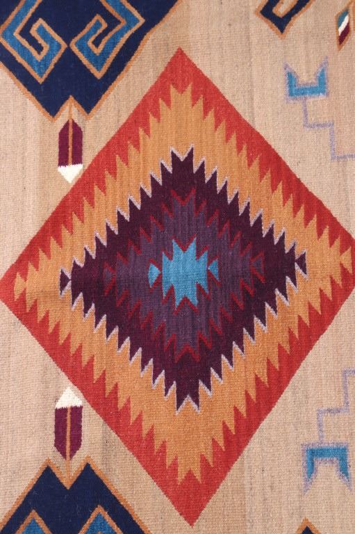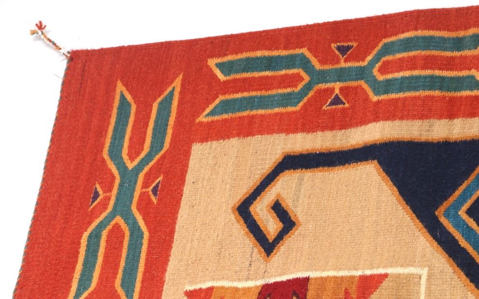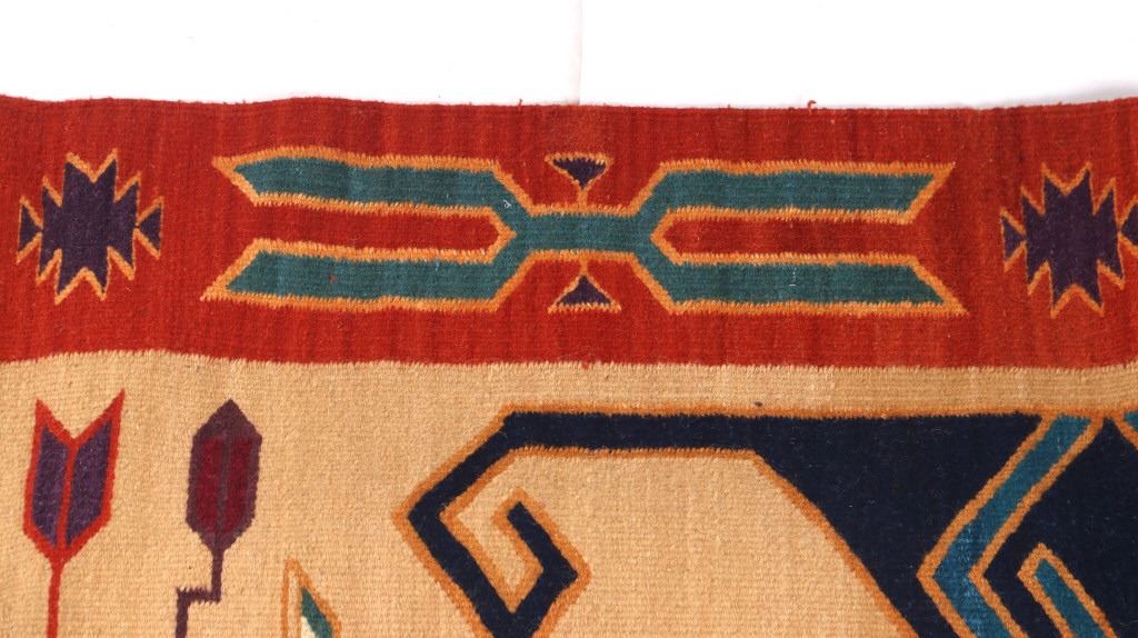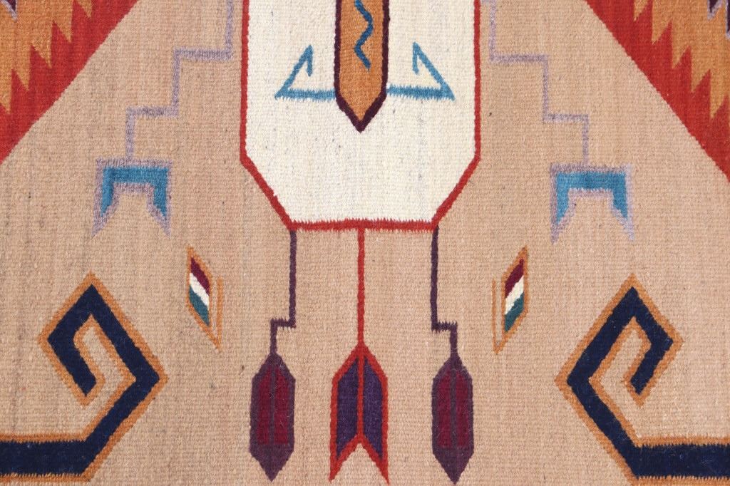 This is an excellent handwoven flat weave large rug by master weaver Enrique Ruiz using 100% soft fine handspun wool in an outstanding Tees Miel pattern. The rug was handwoven with a tight weave using 100% locally handspun wool yarn that offers natural variegation and durability with color fast aniline dyes. Tight handwoven weave displayed with bold colors in the extremely detailed Tees Miel pattern in the time-honored Zapotec multi-generational craft by a master weaver, Enrique Ruiz. This bold and beautiful rug shows a fantastic marriage between traditions, showing a rich Navajo Teec Nos Pos styling with a Zapotec Oaxaca Indian bright color and immensely detailed flair. This example shows a heathered tan background with traditional Tees emblems infused with lively coloration having a decorative bold border. The piece is in brand new condition with fine tight weave and unique multi-colored braided ends. The nice large rug measures 5’ by 8’ (5 foot by 8 foot). This is a contemporary rug hand woven by Enrique Ruiz, a Zapotec Indian from a small weaving village, in amazing natural dyes and wool showing a nice large size.