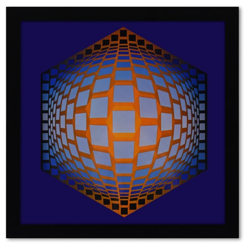 "Tegla - Hat de la serie Structures Universelles De LHexagone" is a heliogravure print on paper published in 1975 by Victor Vasarely (1908-1997). This piece comes custom framed with a letter of authenticity and with a 1976 Vasarely paperback. Measures approx. 11.5" x 11.5" (frame) 9" x 9" (image).