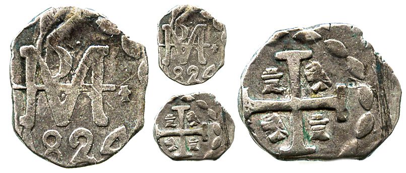 Tegucigalpa, Honduras, "imitation cob" 1/2 real, 1824, very rare. KM-7.1 for type. 1.4 grams. Toned VF with old test-cut at edge, nice inner details including full monogram (but with dot instead of S at right side) and date (4 digits instead of 2), choice full cross-lions-castles, rare and desirable provisional issue.