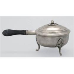 Pest, 1792, antik ezüst, Mathias Kuhnert, K: 489, fedél Pest 1798, Jos. Prandtner id. empire stílusú sima vonalú kerek test és fedél, három öntött akantuszleveles és karmos lábbal, fa fogóval, br. 562,7 g; m: 12 cm, "SB" és "MD" monogrammvésettel a fedélen