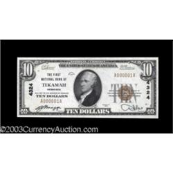 <TABLE cellSpacing=0 cellPadding=0 width="100%" bgColor=#000000 border=0><TBODY> <TR><TD width="100%"><TABLE cellSpacing=1 cellPadding=3 width="100%" border=0><TBODY><TR><TD width="100%" bgColor=#79735c><FONT face=arial color=#ffffff size=3><B>Description</B> </FONT></TD></TR><TR><TD width="100%" bgColor=#ffffff><FONT face=arial size=2><B>Tekamah, NE</B></I> - $10 1929 Ty. 1 <B>The First NB</B></I> Ch. # 4324<BR>A perfectly margined beauty from the Florida collection. This serial number A000001A note displays great color and appeal. <B>Gem Crisp Uncirculated.</B></I> (2,000-2,500 ) </FONT></TD></TR></TBODY></TABLE></TD></TR></TBODY></TABLE><BR><TABLE cellSpacing=0 cellPadding=0 width="100%" bgColor=#000000 border=0><TBODY><TR> Important notice: Heritage usually auctions material at the rate of 200-250 lots per hour. On some occasions eBay Live bid software or the Internet may not be able to keep up with the pace of the auction. We recommend placing a realistic absentee bid now as insurance to avoid disappointment. Occasionally the auctioneer may eliminate or reject an eBay Live bid, and the auctioneer may also reopen a lot after the close of the eBay live bidding (usually because we missed an audience bid), and may reject your bid even if it shows you as the winning bidder. By bidding via eBay Live, you agree that Heritage may award the lot to another bidder at its sole discretion under the circumstances described above or any other reasonable circumstances. Also please note that all Heritage lots purchased through eBay Live carry a 20% Buyer's Premium. Please make sure you read the Terms and Conditions before you bid.</TR></TBODY></TABLE>