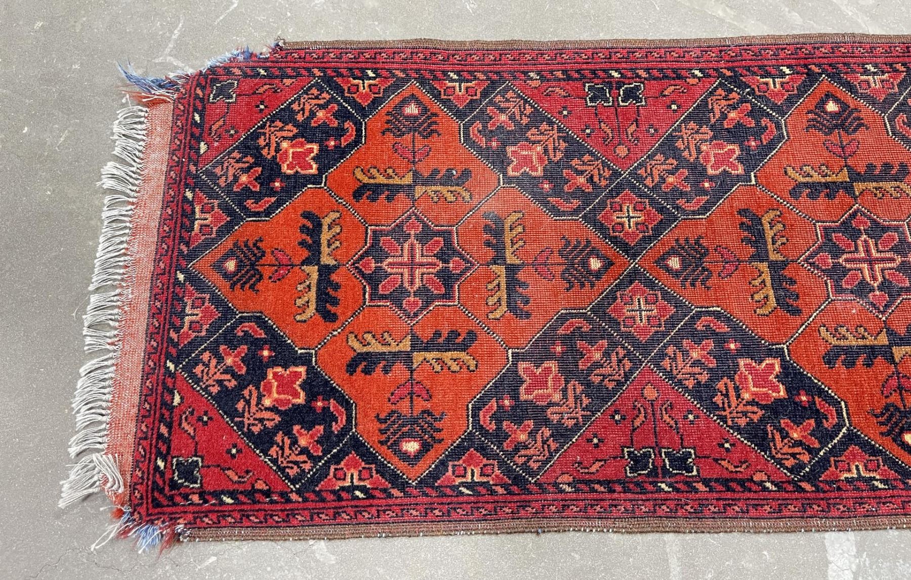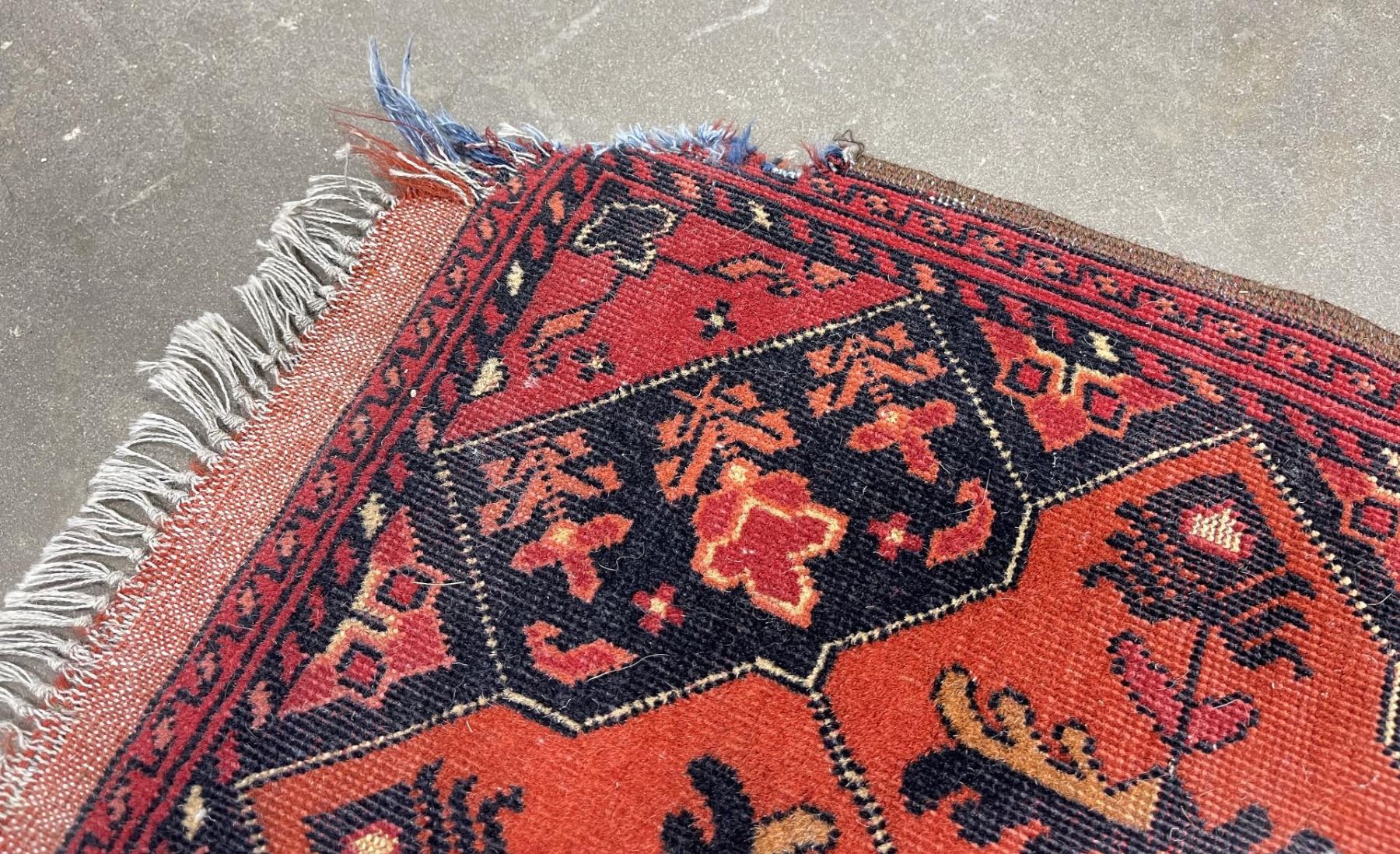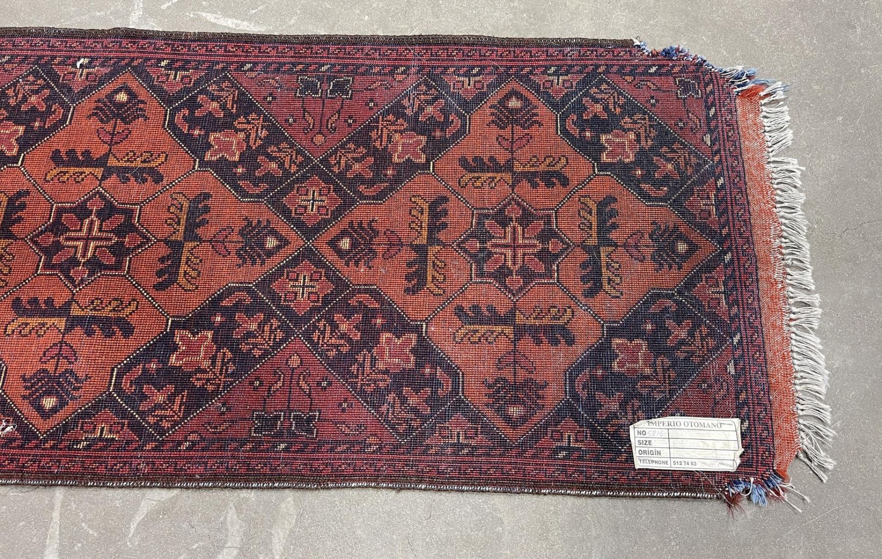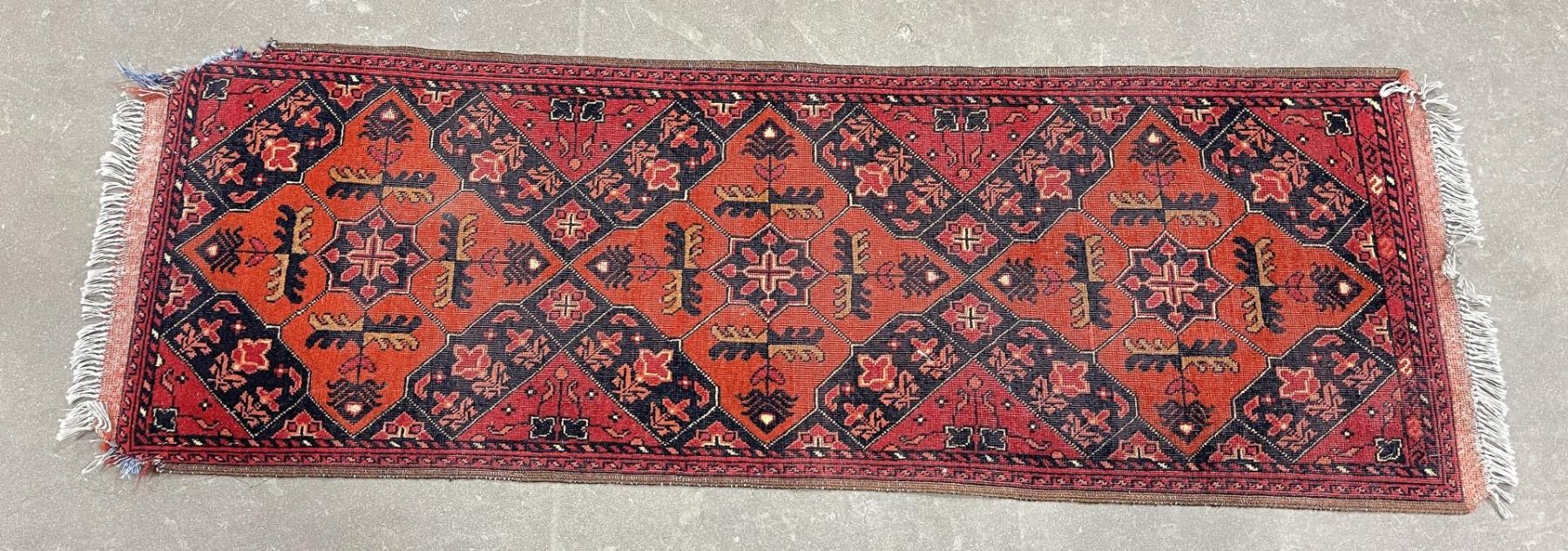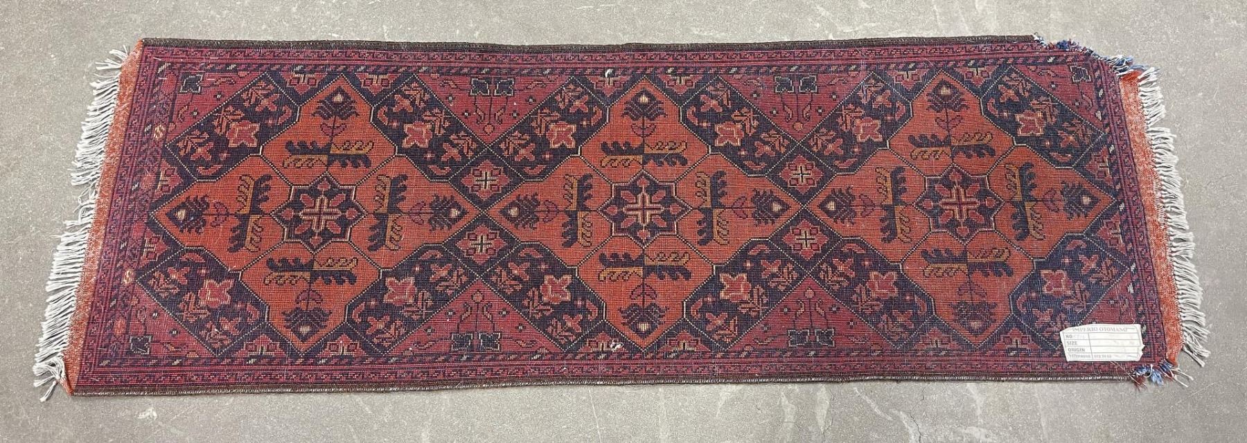 Nice older rug with tag as shown. 20.5" by 61.5" including fringe.