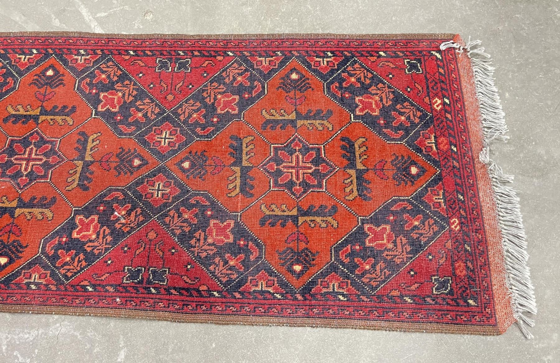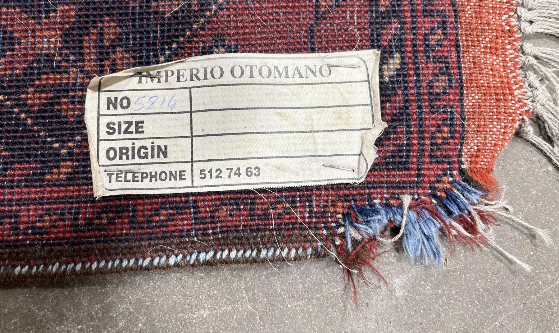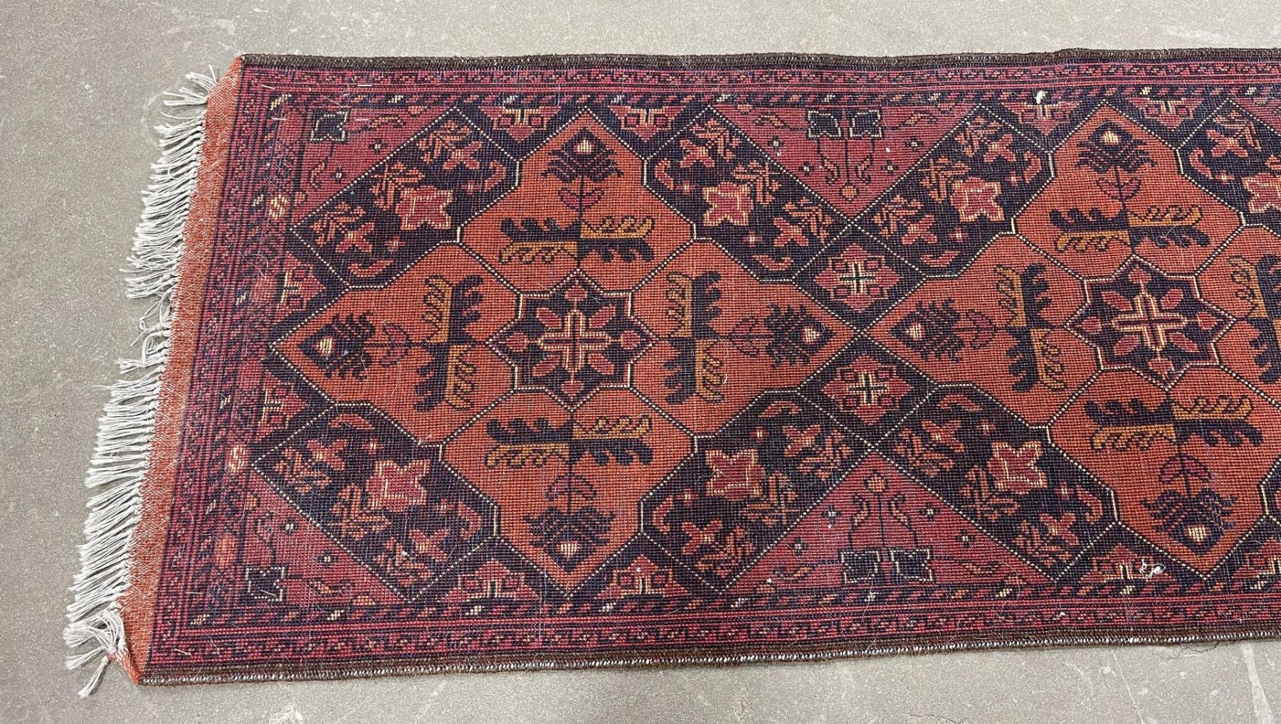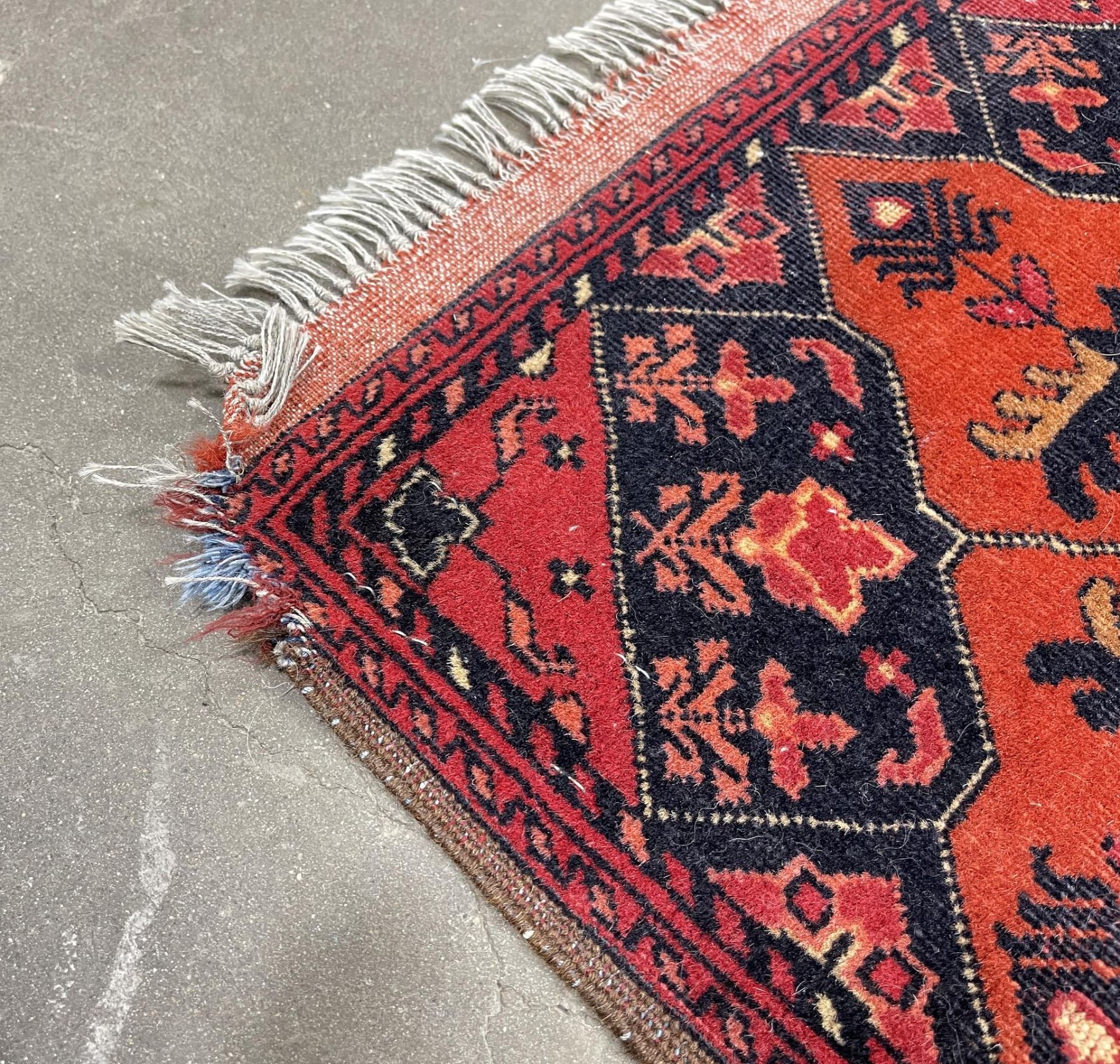 Nice older rug with tag as shown. 20.5" by 61.5" including fringe.