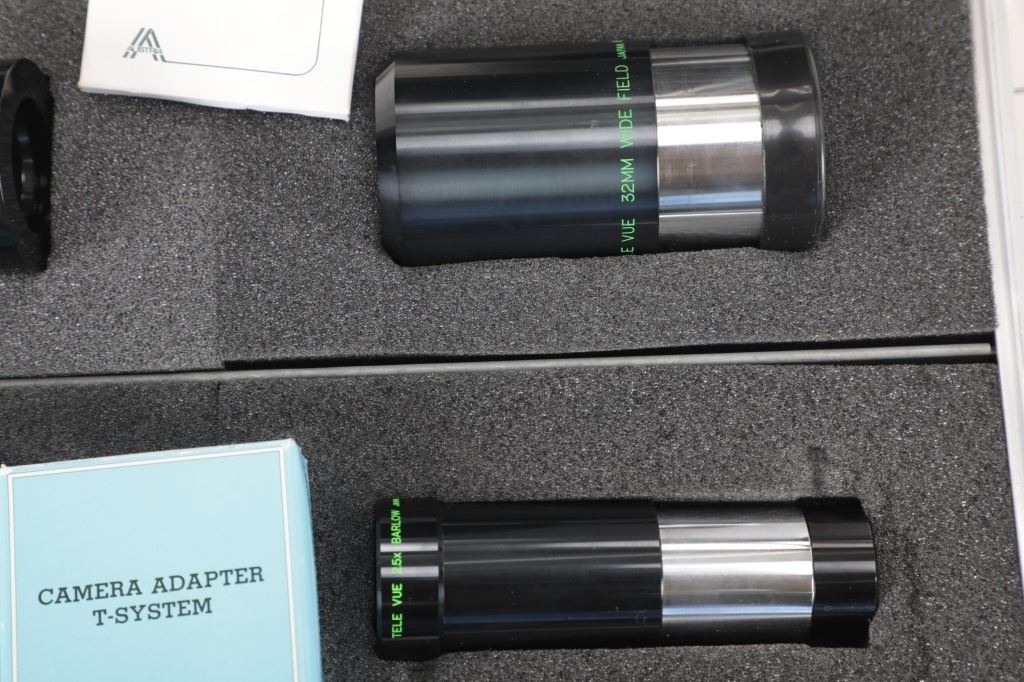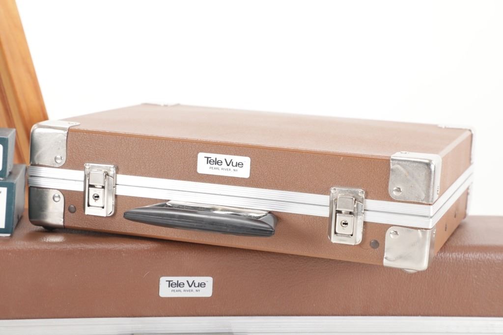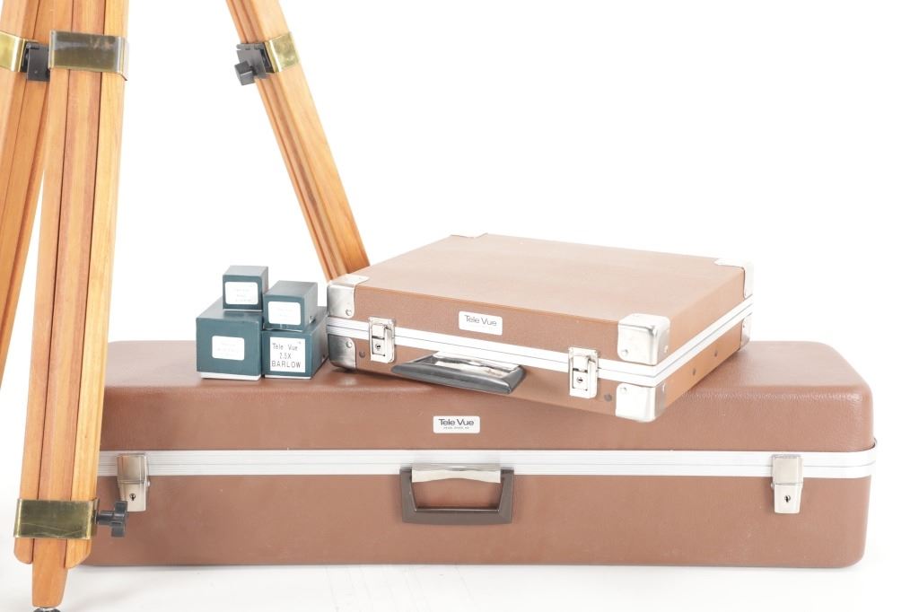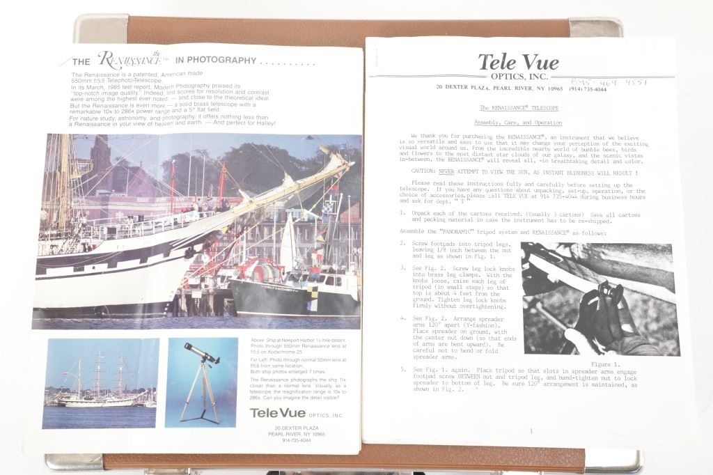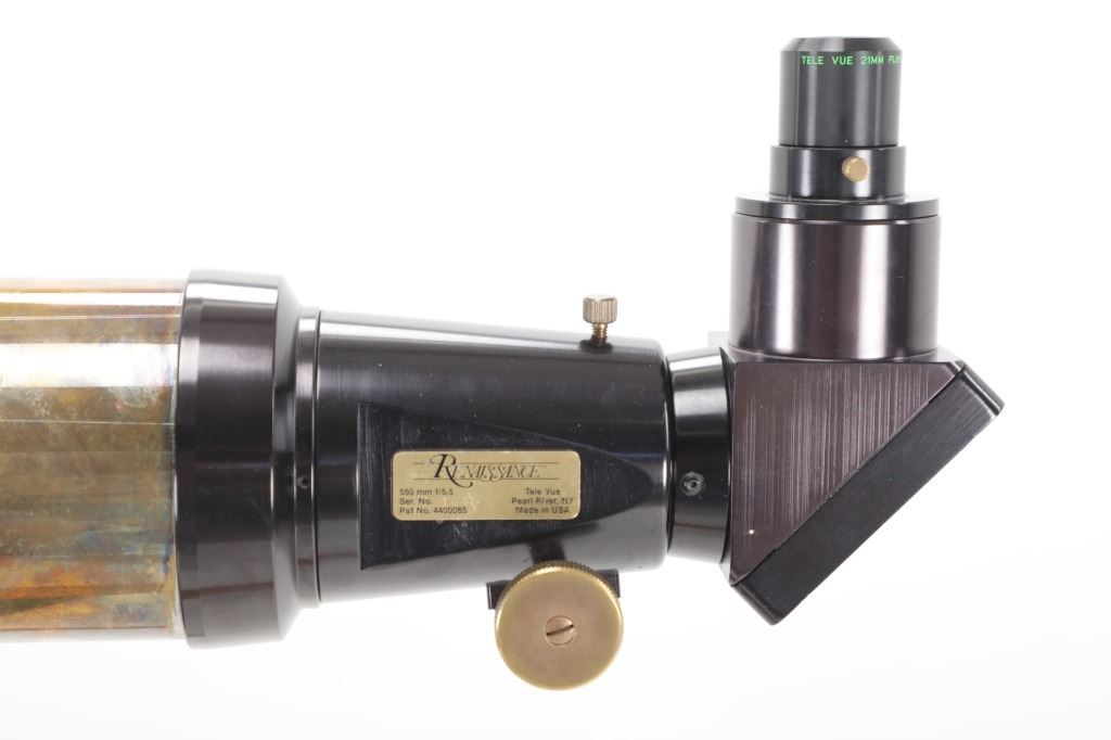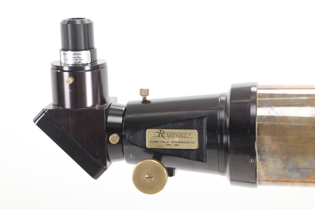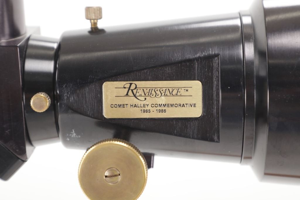 Featured in this lot is this beautiful Tele Vue Renaissance Comet Halley Commemorative 550mm telescope made by Tele Vue in Pearl River, New York circa 1985-1986. Tele Vue Optics, Inc. was created in 1977 by Al Nagler, a Bronx-based optical engineer who previously worked on Apollo simulators. The company began by producing projection lenses for huge projection-screen televisions, but it is now well-known in the astronomy community. This Renaissance is a commemorative edition marking the return of Halley's Comet in 1986. Despite being an early model, the telescope already had many of Tele Vue's later distinctive characteristics, such as the focuser, clamshell, and tube design. Like all Tele Vues, it was handcrafted in the United States. The Renaissance included a sturdy case, mount, tripod, 2" diagonal, 26mm Plossl eyepiece and instructions. This Renaissance rendition is unique in that it was created to mark the much anticipated return of Halley's Comet in 1986. Near the view port are two brass plaques, one on either side of the telescope. The one on the left side reads, "Renaissance 550mm f/5.5 Ser. No. 1646 Pat. No. 4400065 / Tele Vue Pearl River, NY Made in U.S.A.", while the one on the right reads, "Renaissance Comet Halley Commemorative 1985-1986". This telescope comes with the original carry case for the actual telescope and a smaller brief case carrying two T-System camera adapters (One Canon & One Nikon), a Tele Vue 32mm Wide Field, a Tele Vue Nagler 4.8mm, a Tele Vue 10.5mm PLoSSL, a Tele Vue 21mm PLoSSL, a Tele Vue 2.5x Barlow, two tube adapters, cleaning tissues, a cleaning cloth and two instruction packets. The brief case and telescope carry case come with two keys to lock and secure the items. The telescope shows a lovely patina on the brass from its age, but can be polished off if needed as the brass has not been lacquered. The front of the telescope features a screw-fit metal cap to keep the telescope glass protected. To assemble the telescope, open the tripod and attach the metal plate between the legs for extra stability, then, attach the mount to the top of the tripod and screw the telescope onto the mount. The telescope, carry cases and eyepieces show good condition overall with very little wear present due to its age and use over the years. The telescope shows a crisp, clear view and focus knobs turn smooth and easy. No signs of obvious damage is present. A beautiful piece for collectors, explorers and photographers alike! When assembled, the scope measures approx. 39" in length, 36 1/2" in width and 41 1/4" in height (at lowest point). The telescope carry case measures 9" L x 35 5/8" W x 8 1/4" H, while the briefcase measures 13 1/2" L x 15 1/4" W x 3 7/8" H. The collective weight of all items is 48 pounds.