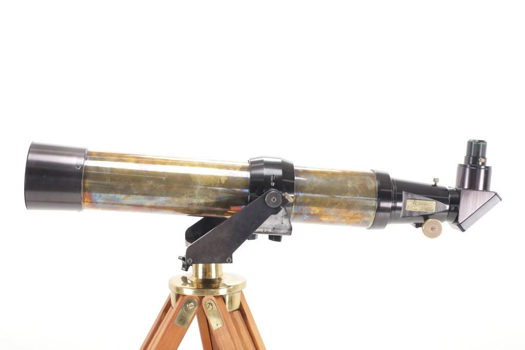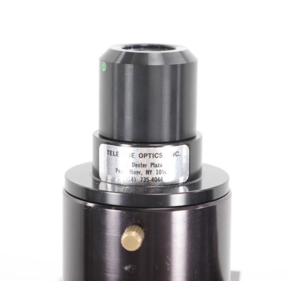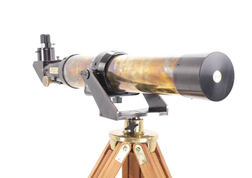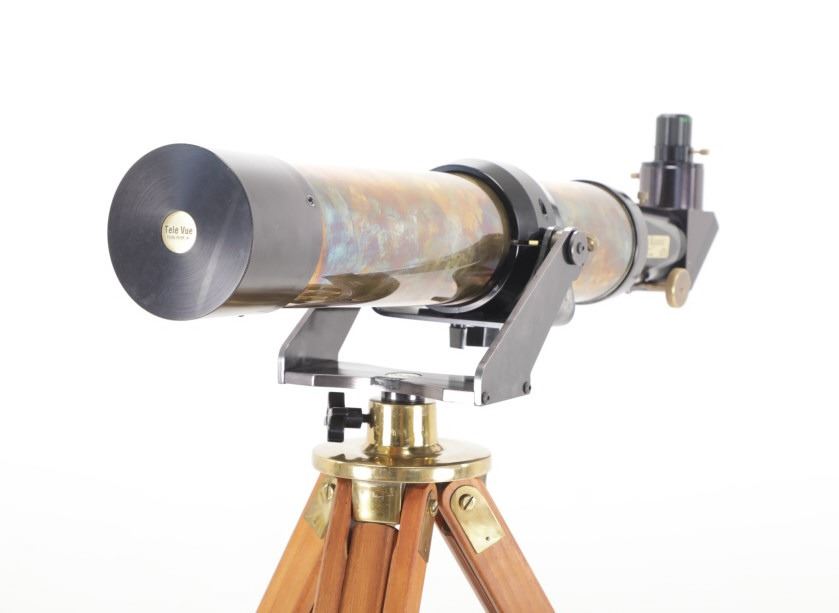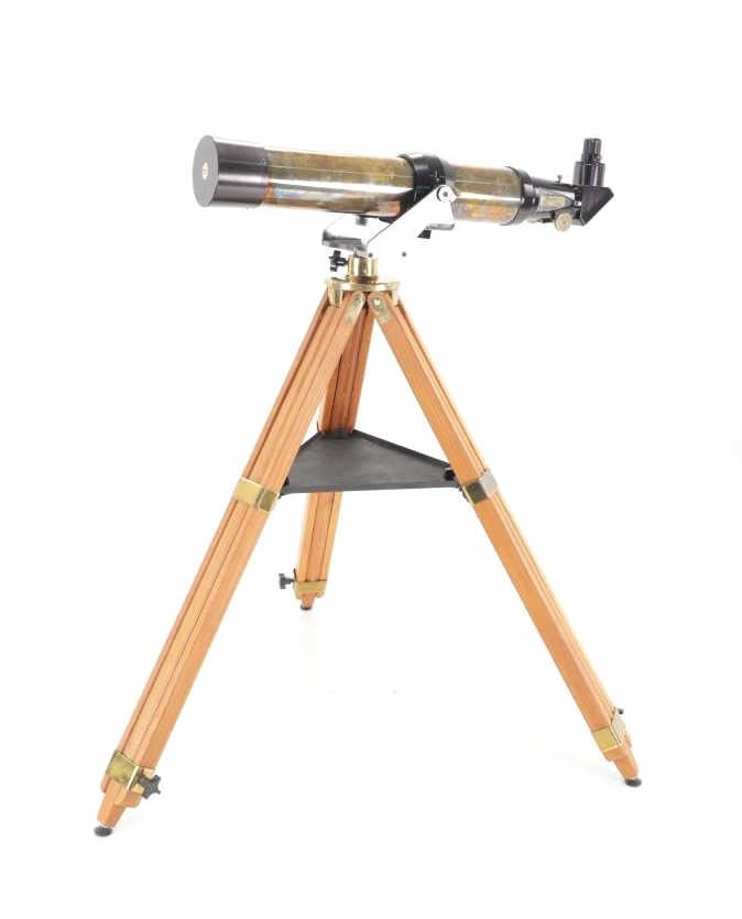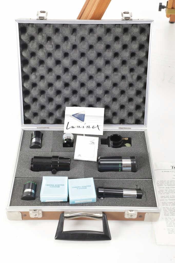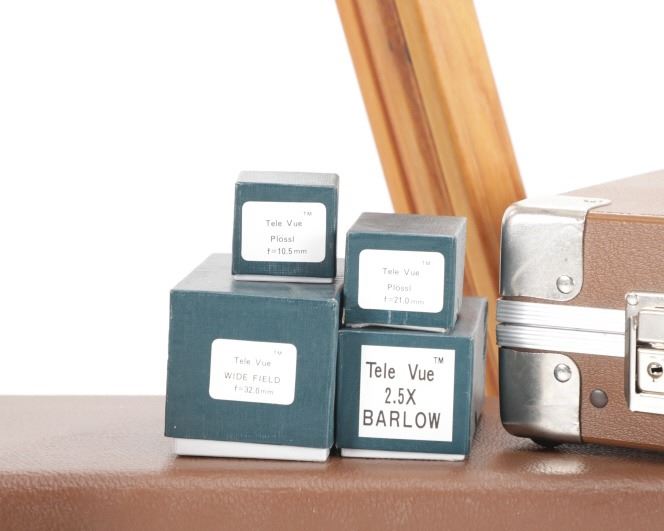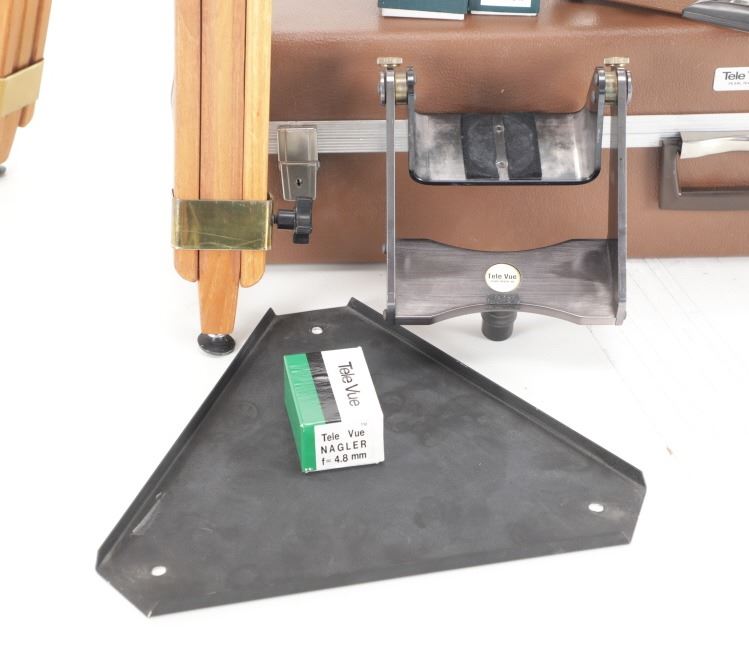 Featured in this lot is this beautiful Tele Vue Renaissance Comet Halley Commemorative 550mm telescope made by Tele Vue in Pearl River, New York circa 1985-1986. Tele Vue Optics, Inc. was created in 1977 by Al Nagler, a Bronx-based optical engineer who previously worked on Apollo simulators. The company began by producing projection lenses for huge projection-screen televisions, but it is now well-known in the astronomy community. This Renaissance is a commemorative edition marking the return of Halley's Comet in 1986. Despite being an early model, the telescope already had many of Tele Vue's later distinctive characteristics, such as the focuser, clamshell, and tube design. Like all Tele Vues, it was handcrafted in the United States. The Renaissance included a sturdy case, mount, tripod, 2" diagonal, 26mm Plossl eyepiece and instructions. This Renaissance rendition is unique in that it was created to mark the much anticipated return of Halley's Comet in 1986. Near the view port are two brass plaques, one on either side of the telescope. The one on the left side reads, "Renaissance 550mm f/5.5 Ser. No. 1646 Pat. No. 4400065 / Tele Vue Pearl River, NY Made in U.S.A.", while the one on the right reads, "Renaissance Comet Halley Commemorative 1985-1986". This telescope comes with the original carry case for the actual telescope and a smaller brief case carrying two T-System camera adapters (One Canon & One Nikon), a Tele Vue 32mm Wide Field, a Tele Vue Nagler 4.8mm, a Tele Vue 10.5mm PLoSSL, a Tele Vue 21mm PLoSSL, a Tele Vue 2.5x Barlow, two tube adapters, cleaning tissues, a cleaning cloth and two instruction packets. The brief case and telescope carry case come with two keys to lock and secure the items. The telescope shows a lovely patina on the brass from its age, but can be polished off if needed as the brass has not been lacquered. The front of the telescope features a screw-fit metal cap to keep the telescope glass protected. To assemble the telescope, open the tripod and attach the metal plate between the legs for extra stability, then, attach the mount to the top of the tripod and screw the telescope onto the mount. The telescope, carry cases and eyepieces show good condition overall with very little wear present due to its age and use over the years. The telescope shows a crisp, clear view and focus knobs turn smooth and easy. No signs of obvious damage is present. A beautiful piece for collectors, explorers and photographers alike! When assembled, the scope measures approx. 39" in length, 36 1/2" in width and 41 1/4" in height (at lowest point). The telescope carry case measures 9" L x 35 5/8" W x 8 1/4" H, while the briefcase measures 13 1/2" L x 15 1/4" W x 3 7/8" H. The collective weight of all items is 48 pounds.