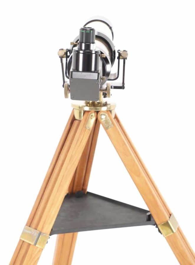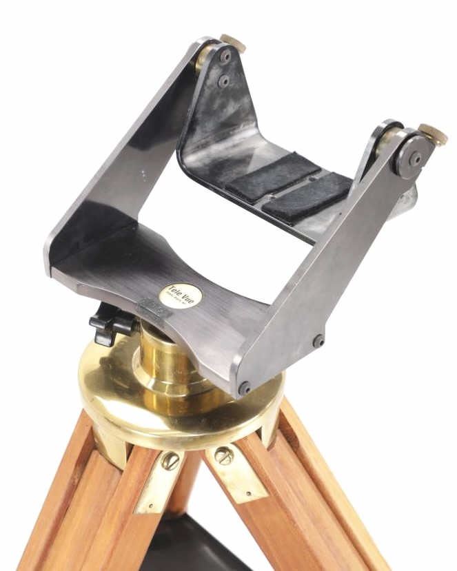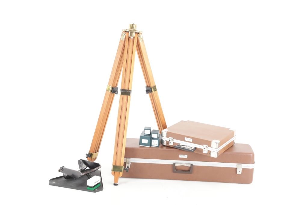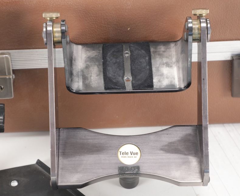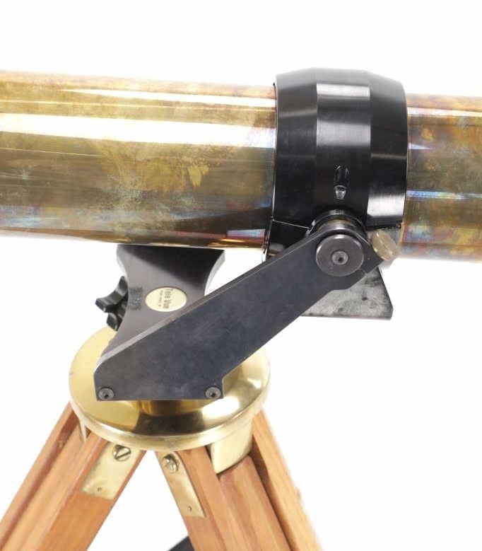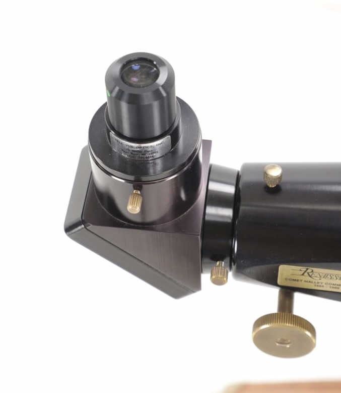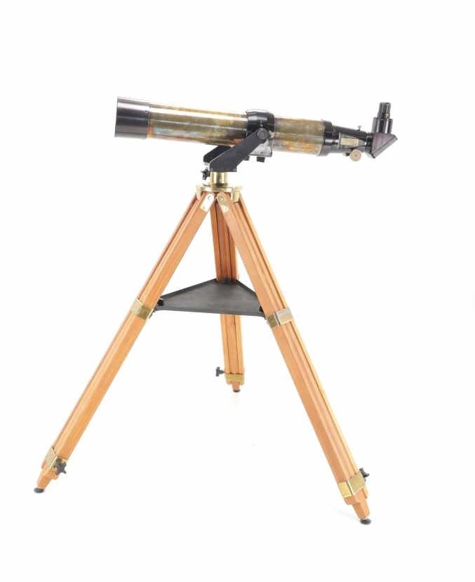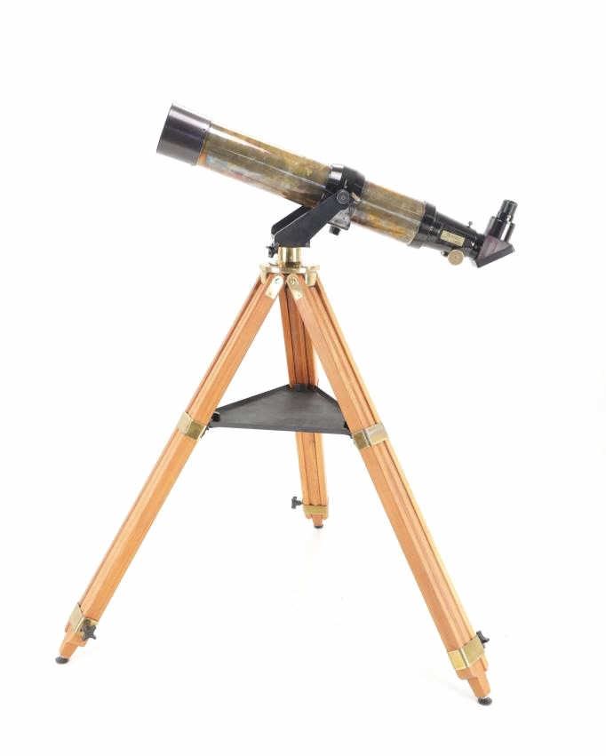 Featured in this lot is this beautiful Tele Vue Renaissance Comet Halley Commemorative 550mm telescope made by Tele Vue in Pearl River, New York circa 1985-1986. Tele Vue Optics, Inc. was created in 1977 by Al Nagler, a Bronx-based optical engineer who previously worked on Apollo simulators. The company began by producing projection lenses for huge projection-screen televisions, but it is now well-known in the astronomy community. This Renaissance is a commemorative edition marking the return of Halley's Comet in 1986. Despite being an early model, the telescope already had many of Tele Vue's later distinctive characteristics, such as the focuser, clamshell, and tube design. Like all Tele Vues, it was handcrafted in the United States. The Renaissance included a sturdy case, mount, tripod, 2" diagonal, 26mm Plossl eyepiece and instructions. This Renaissance rendition is unique in that it was created to mark the much anticipated return of Halley's Comet in 1986. Near the view port are two brass plaques, one on either side of the telescope. The one on the left side reads, "Renaissance 550mm f/5.5 Ser. No. 1646 Pat. No. 4400065 / Tele Vue Pearl River, NY Made in U.S.A.", while the one on the right reads, "Renaissance Comet Halley Commemorative 1985-1986". This telescope comes with the original carry case for the actual telescope and a smaller brief case carrying two T-System camera adapters (One Canon & One Nikon), a Tele Vue 32mm Wide Field, a Tele Vue Nagler 4.8mm, a Tele Vue 10.5mm PLoSSL, a Tele Vue 21mm PLoSSL, a Tele Vue 2.5x Barlow, two tube adapters, cleaning tissues, a cleaning cloth and two instruction packets. The brief case and telescope carry case come with two keys to lock and secure the items. The telescope shows a lovely patina on the brass from its age, but can be polished off if needed as the brass has not been lacquered. The front of the telescope features a screw-fit metal cap to keep the telescope glass protected. To assemble the telescope, open the tripod and attach the metal plate between the legs for extra stability, then, attach the mount to the top of the tripod and screw the telescope onto the mount. The telescope, carry cases and eyepieces show good condition overall with very little wear present due to its age and use over the years. The telescope shows a crisp, clear view and focus knobs turn smooth and easy. No signs of obvious damage is present. A beautiful piece for collectors, explorers and photographers alike! When assembled, the scope measures approx. 39" in length, 36 1/2" in width and 41 1/4" in height (at lowest point). The telescope carry case measures 9" L x 35 5/8" W x 8 1/4" H, while the briefcase measures 13 1/2" L x 15 1/4" W x 3 7/8" H. The collective weight of all items is 48 pounds.