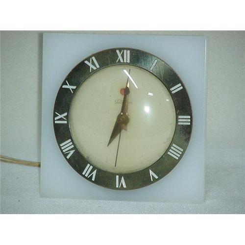 Art Deco, Telechron electric clock, 5 1/4'' square white lucite case holds electric movement framed by brass numbered ring, glass crystal. Working condition. Telechron Inc, Ashland, Mass.