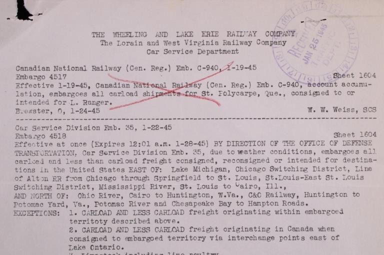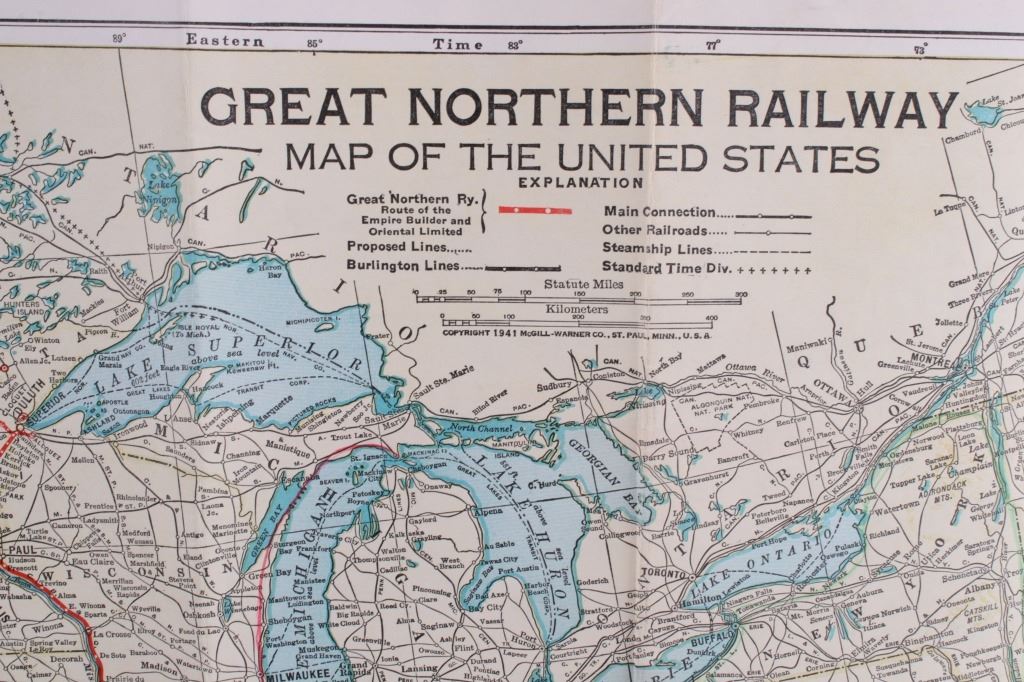 Featured in this lot is this personal telegram correspondence and Great Northern Railway map and brochure, circa 1945. There are two personal telegram correspondence in this collection from The Wheeling and Lake Ere Railway Company and from J.P. Schweiter, Zanesville Plant out of Washington D.C. The brochure shows the route this individual took on the Great American Railway per the United States: The Empire Builder Route and includes brochures of items and scenic highlights from the route. The condition of these telegrams and brochure is good, with wear and browning to the pages consistent with age and storage. The measurements of the telegrams are 11" x 8 1/2" and 9" x 4 1/8".