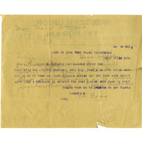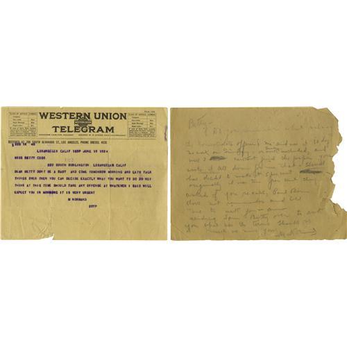 <B>Telegram and Letter by Mabel Normand.</B></I> This lot includes a telegram and a letter to Miss Betty Coss, Mabel's secretary. The telegram, dated June 19, 1924, writes "Dear Betty Don't be a baby and come tomorrow morning and lets [sic] talk things over...do not think at this time should take any offense at whatever I said will expect you in the morning it is very urgent," and signed "M Normand." The letter, written in hand by Mabel, asks Betty if she remembers the terms offered Mabel for a job with "Consolidate" studio, regarding a salary and percentage deal and whether she'd have to work on Sundays. The note mentions Paul Bern, and that since Bern could not remember the proposed terms, he had suggested that Mabel ask Betty. Mabel ends with "Thanks so much we miss you M Normand." Hand-written note is tattered on the right margin. The correspondence suggests a rift had taken place between the star and her secretary -- indeed, Betty Coss had left Mabel's employ after the stormy repercussions of the star's various personal problems. These are intriguing curiosities from a time that Mabel was fighting to revive her scandal-wracked career.