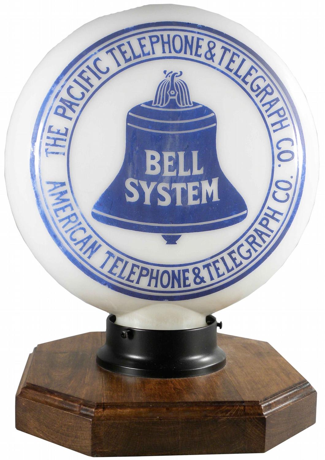 The Pacific Telephone & Telegraph Co./ American Telephone & Telegraph Bell System Glass Light Globe. Two sided, converted to light. One very minor chip at base otherwise very good condition. 12 inch diameter globe.
