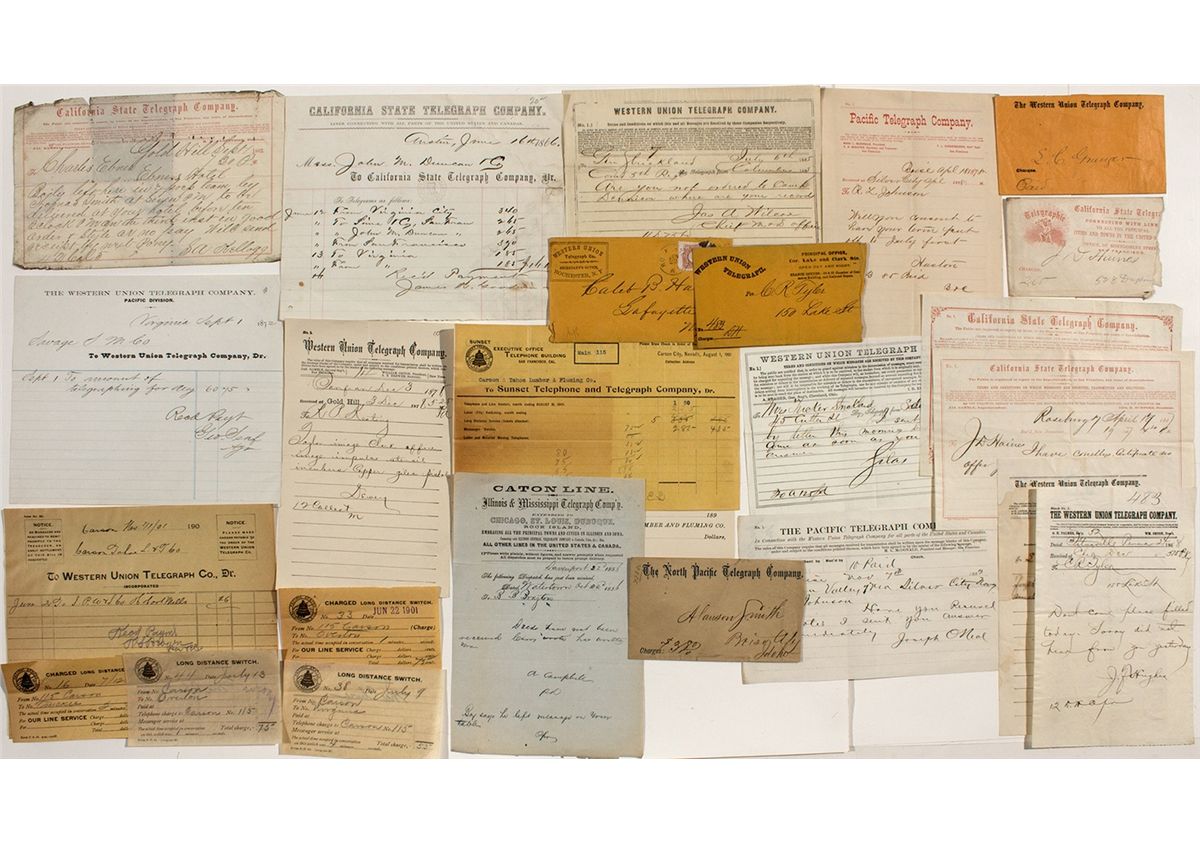 c1860 28 Pieces. California State Telegraph (5), Illinois & Mississippi Telegraph (1), Nevada & Northern Telegraph (1), North Pacific Telegraph (1) (cover, Boise Rare), Pacific Telegraph (2), Sunset Telegraph (1), Western Union (17) (3 covers). Lynn Langdon Collection - HKA#65680