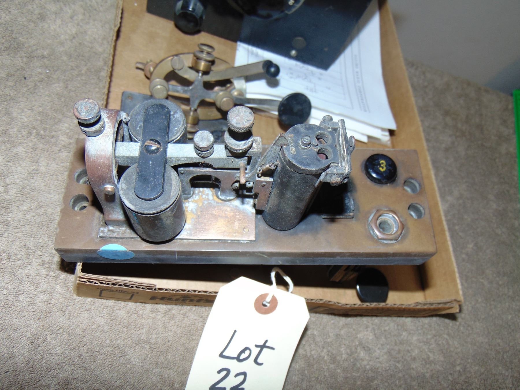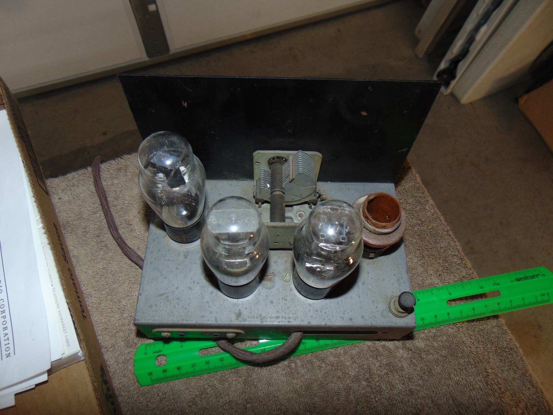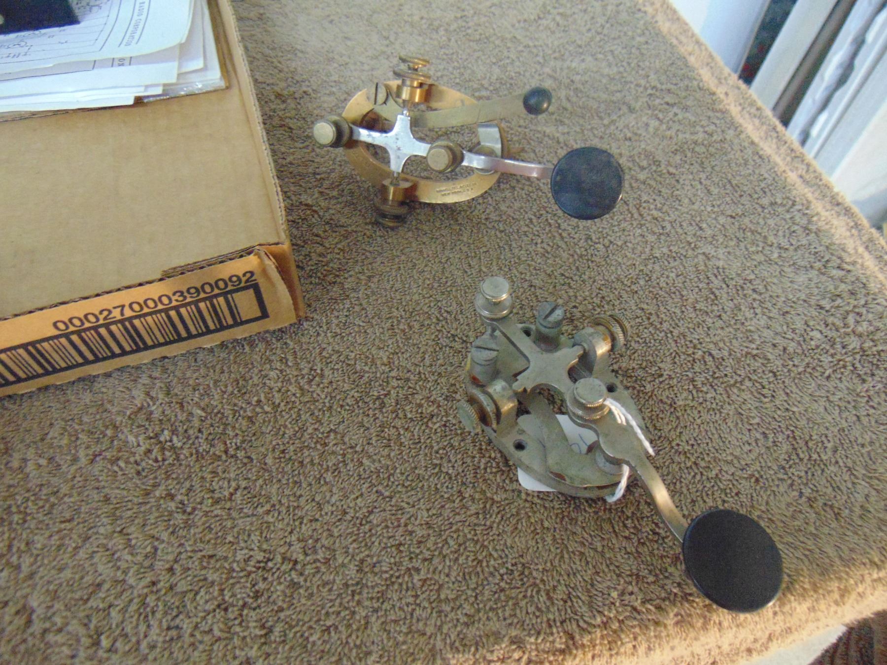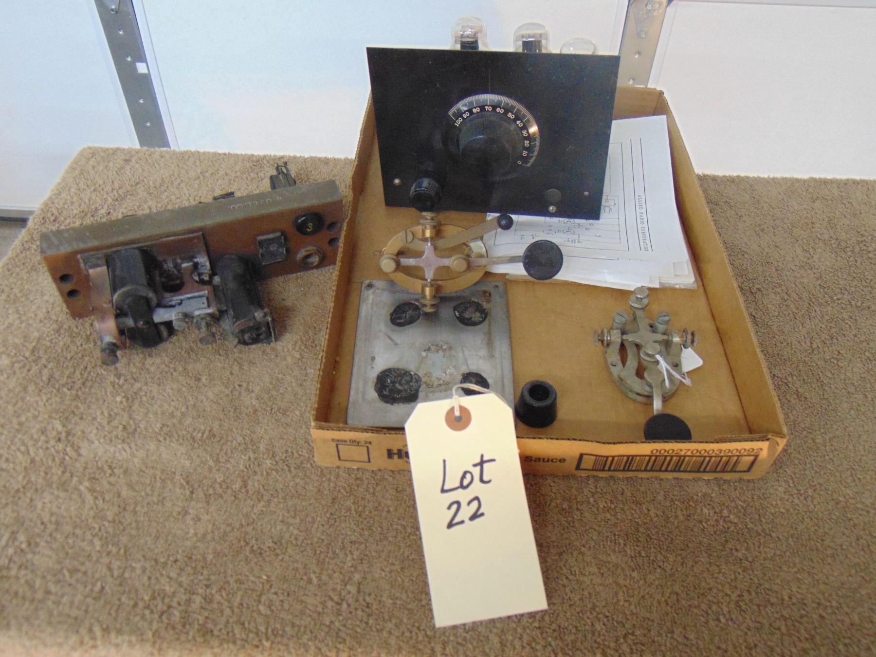Flat of misc. telegraph and radio items; includes 3 tube Meissner regenerative receiver and telegraph keys