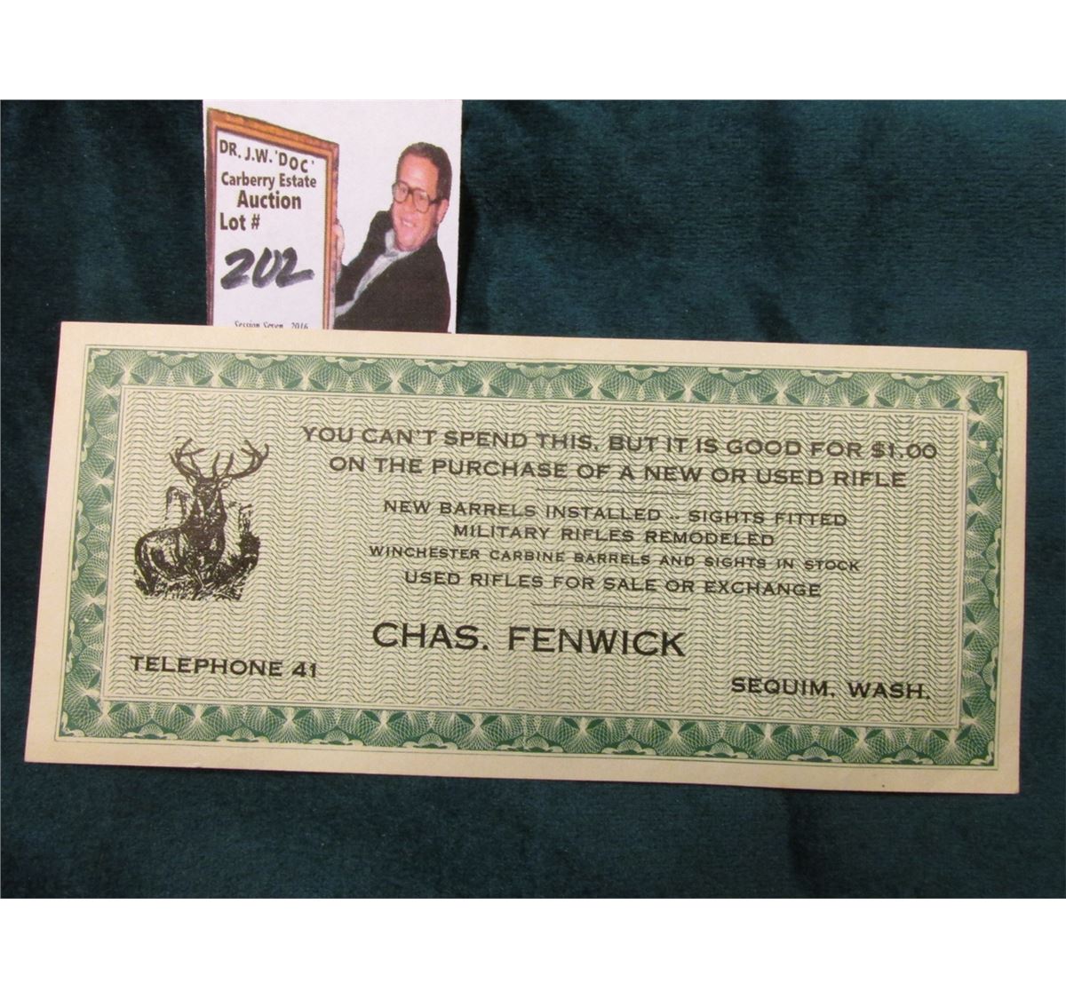 Telephone 41 Sequim, Wash. "Chas. Fenwick" Winchester Carbine Advertising Scrip, Mint condition.