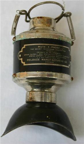 Telephone accessory, Mute-a-phone. “Secret telephone transmitter permits privacy in telephoning.” Pelouze Manufacturing Co., Chicago. Overall length approximately 4 ½".