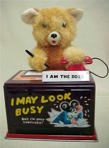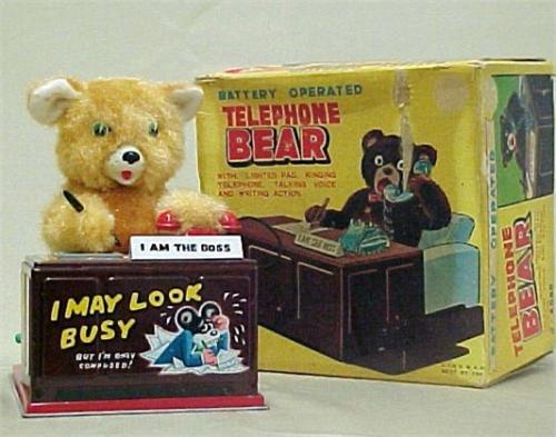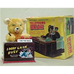 Telephone Bear; metal and plush battery operated bear and desk with original box; 8"high by 7"across; no visible damage on toy; some wear to box.