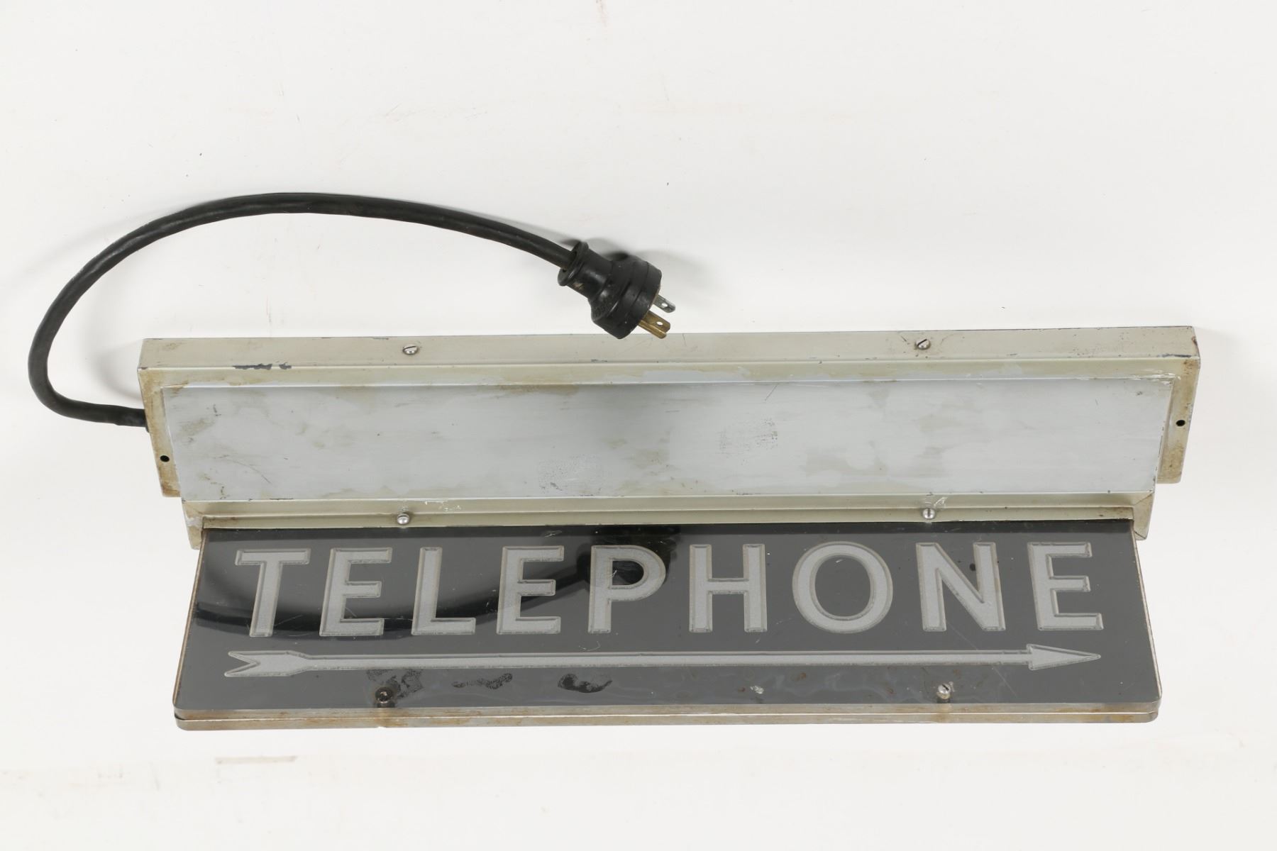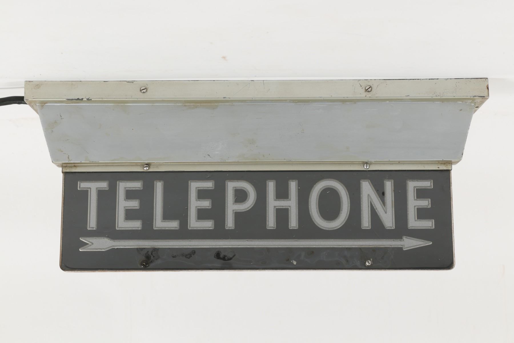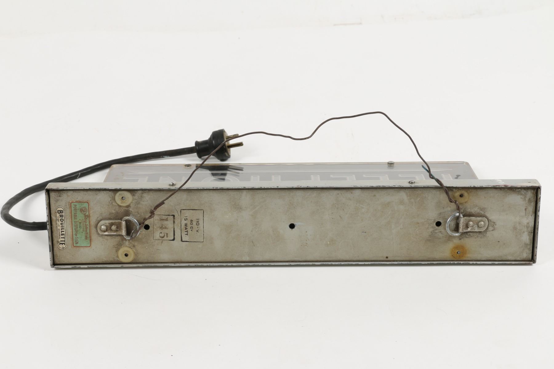 Circa 1950. 2-sided. Flush-mount. Etched acrylic panel with aluminum hardware. 20.5" x 8" x 3.5". Scuffs. Soil and wear to painted steel fixture. $100-200.