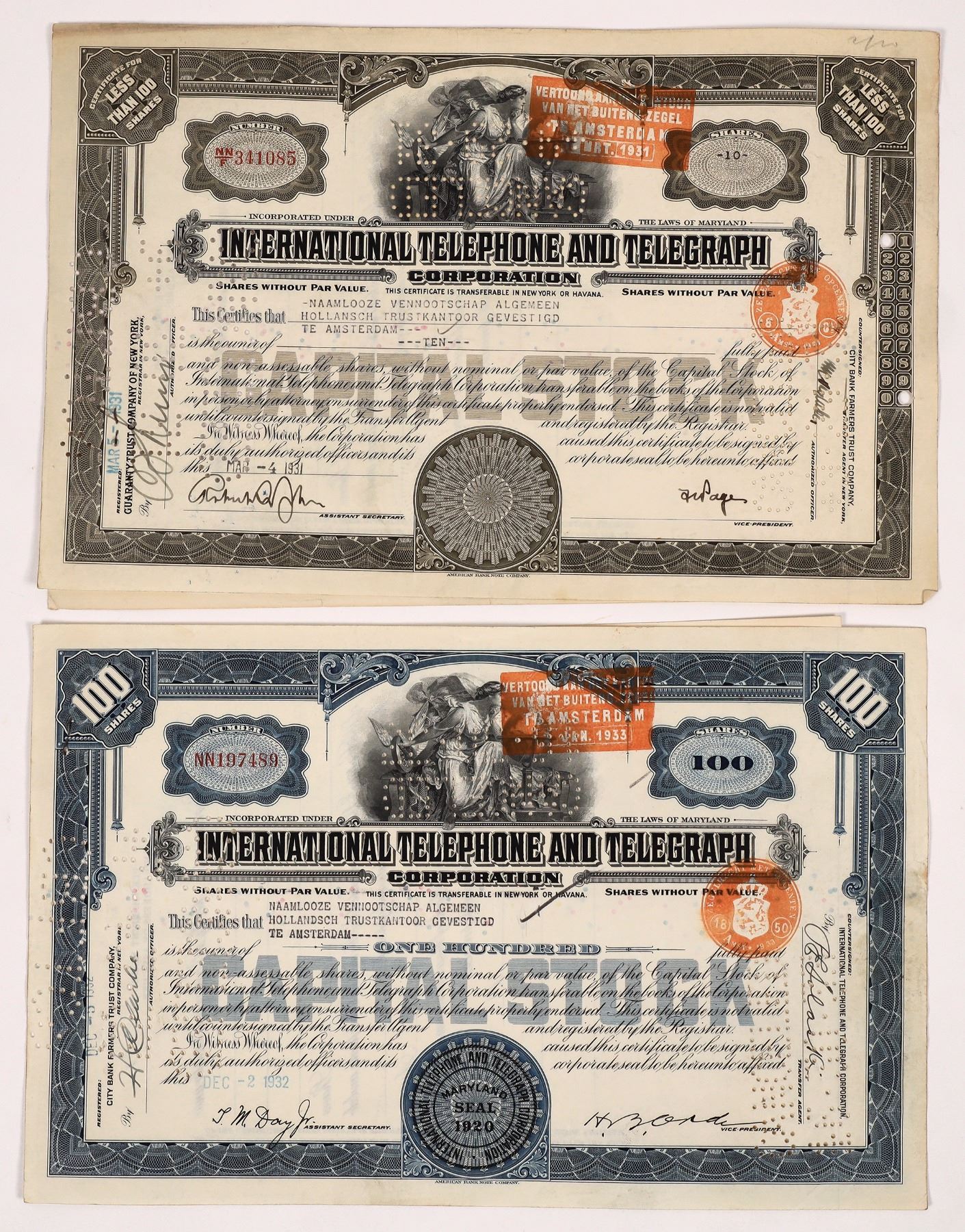 A pair of different International Telephone and Telegraph stock certificates, with foreign revenue stamps, c1931 and 1932. Please see photo(s) for more details.
