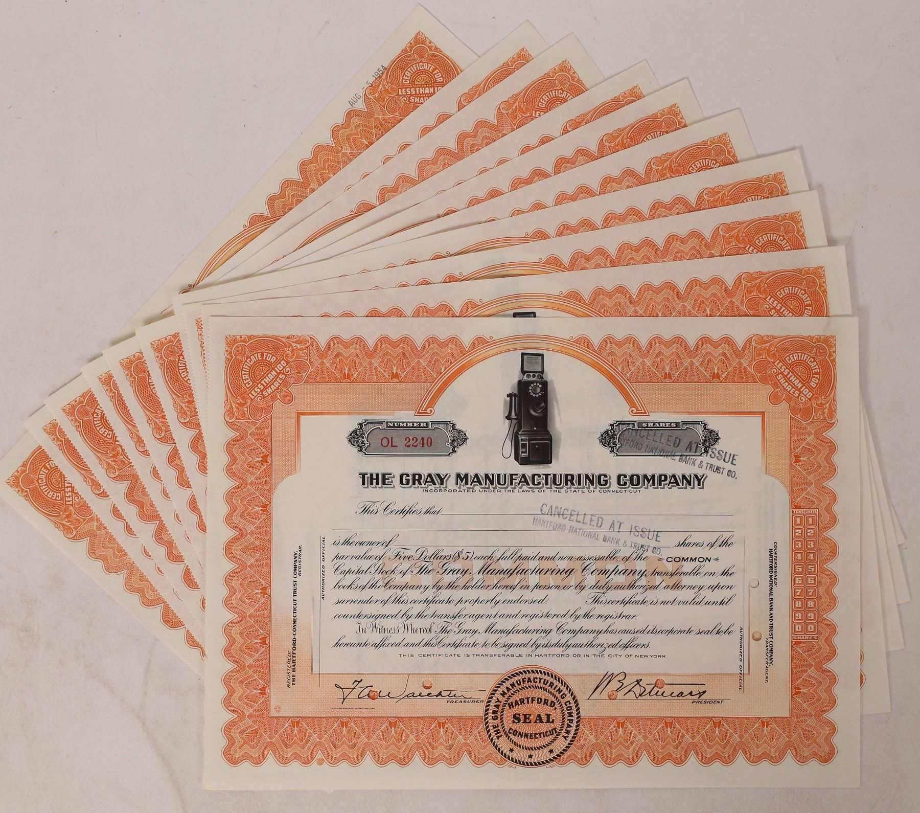 A group of 14 stock certificates from two companies, with vignettes of phones, c1899-1954. The Howard Telephone Co., incorp. Delaware, (4) issued 1899, three with revenue stamps; The Gray Manufacturing Co., incorp Conn, (10) U/C. See photo(s) for more details. Ken Prag Collection
