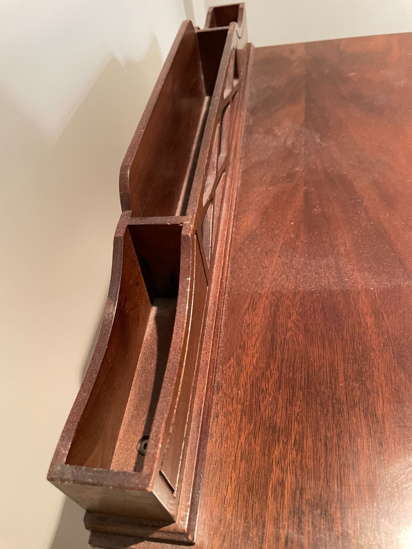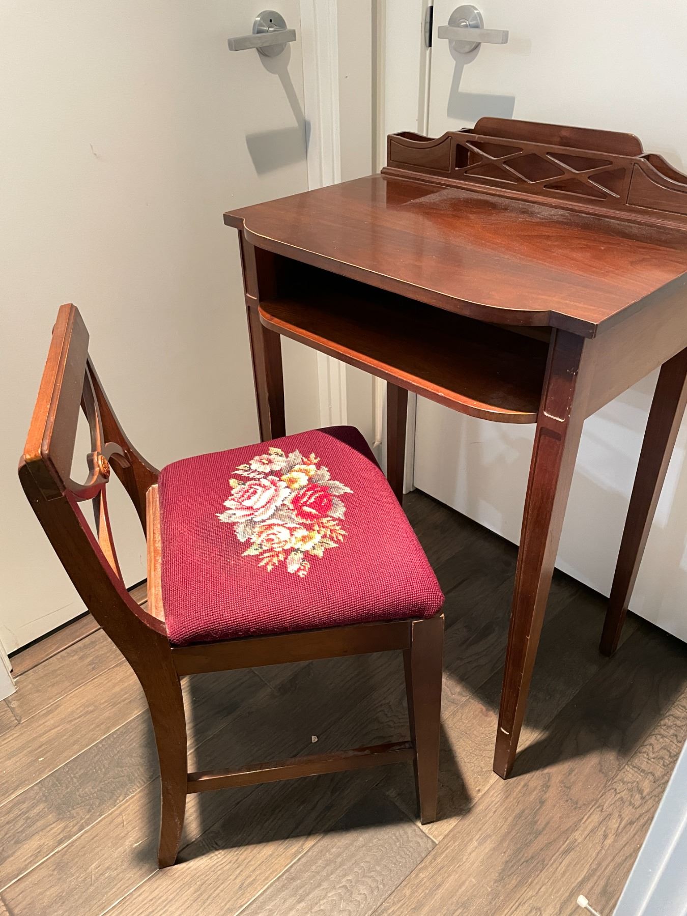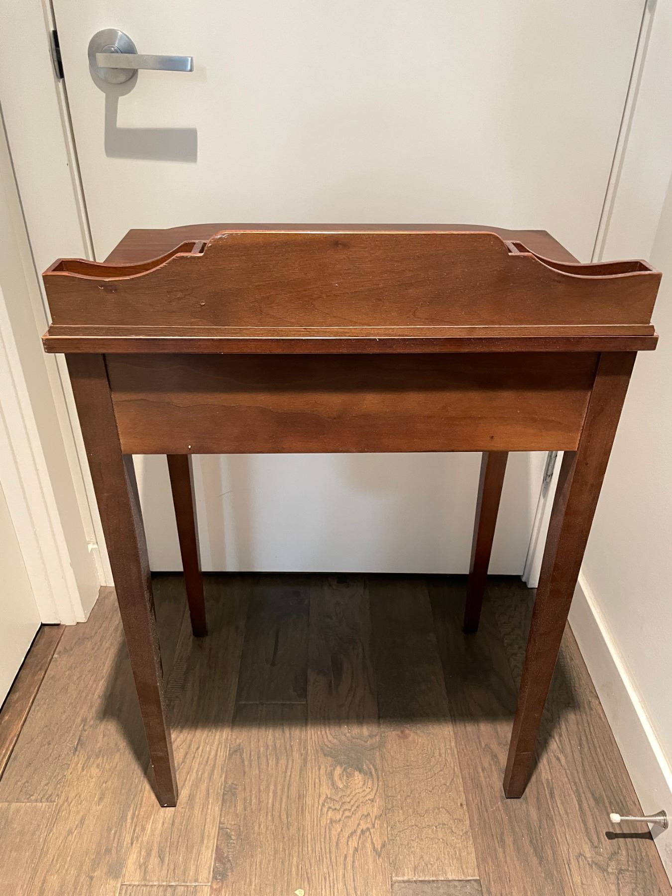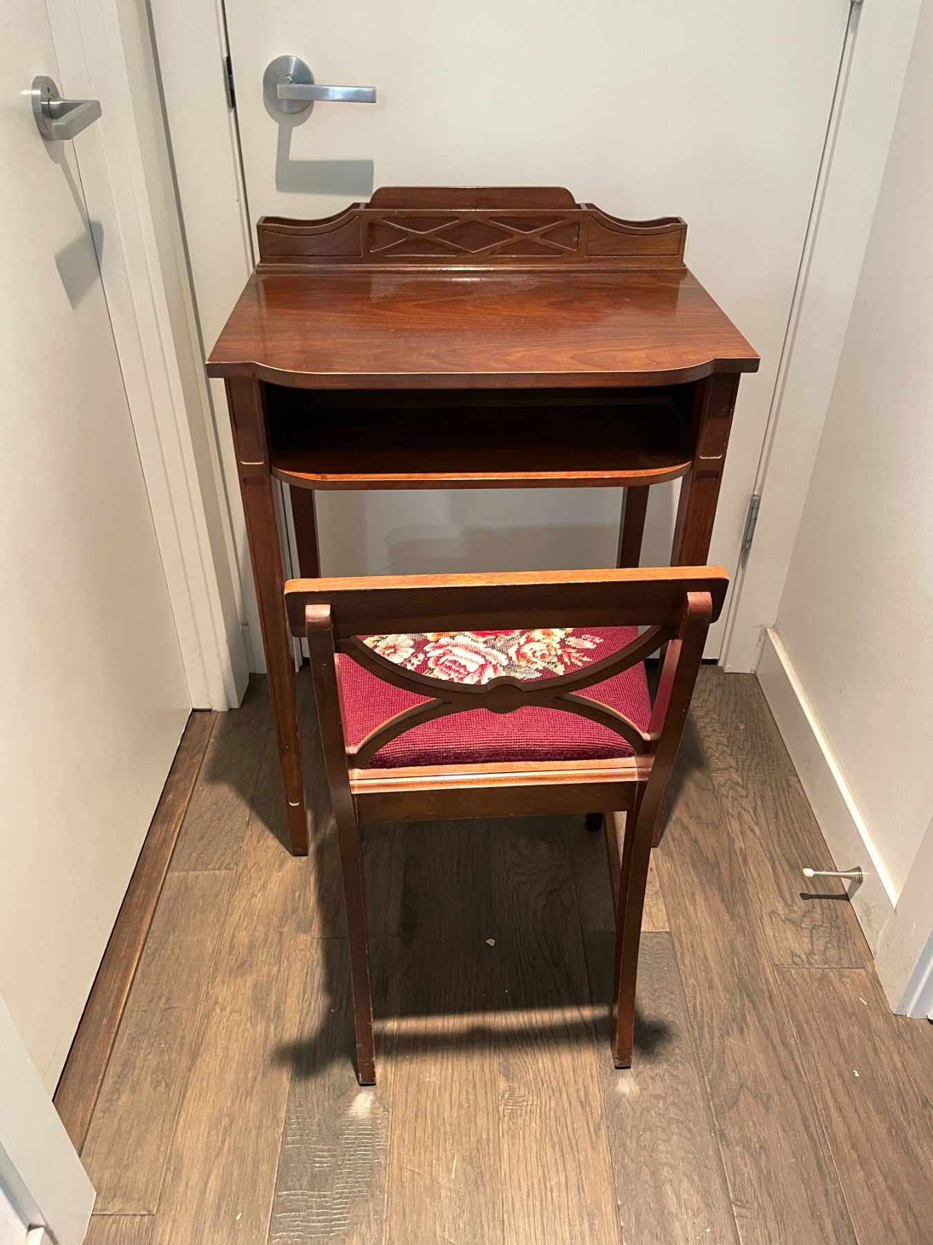 Wood telephone table & chair in great condition. No marking. Table dimensions 33" height x 22" wide x 15.5" deep. Chair dimensions 27" height x 15" wide x 13" deep.