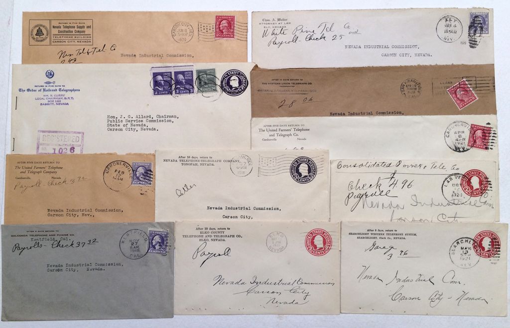 Lot of 10. Includes Nevada Telephone - Telegraph of Tonopah, Consolidated Power & Telephone of Las Vegas, Nevada Telephone Supply of Carson City, Elko County Telephone & Telegraph, Searchlight Western Telephone, White Pine Telephone Co., Golconda Telephone (with CA cancel), United Farmers Telephone & Telegraph of Gardnerville, 1940's Order of Railroad Telegraphers of Hawthorne registered mail, etc.