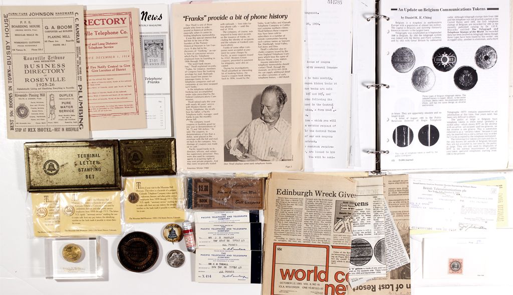 Includes company business letters, Terminal numeral stamping sets, telephone newspaper clippings, telephone produced sewing kit, business cards, anniversary medal, token, pin, token and a telephone company ribbon from the 1952 Republican national convention. Some wear.City: County: State: