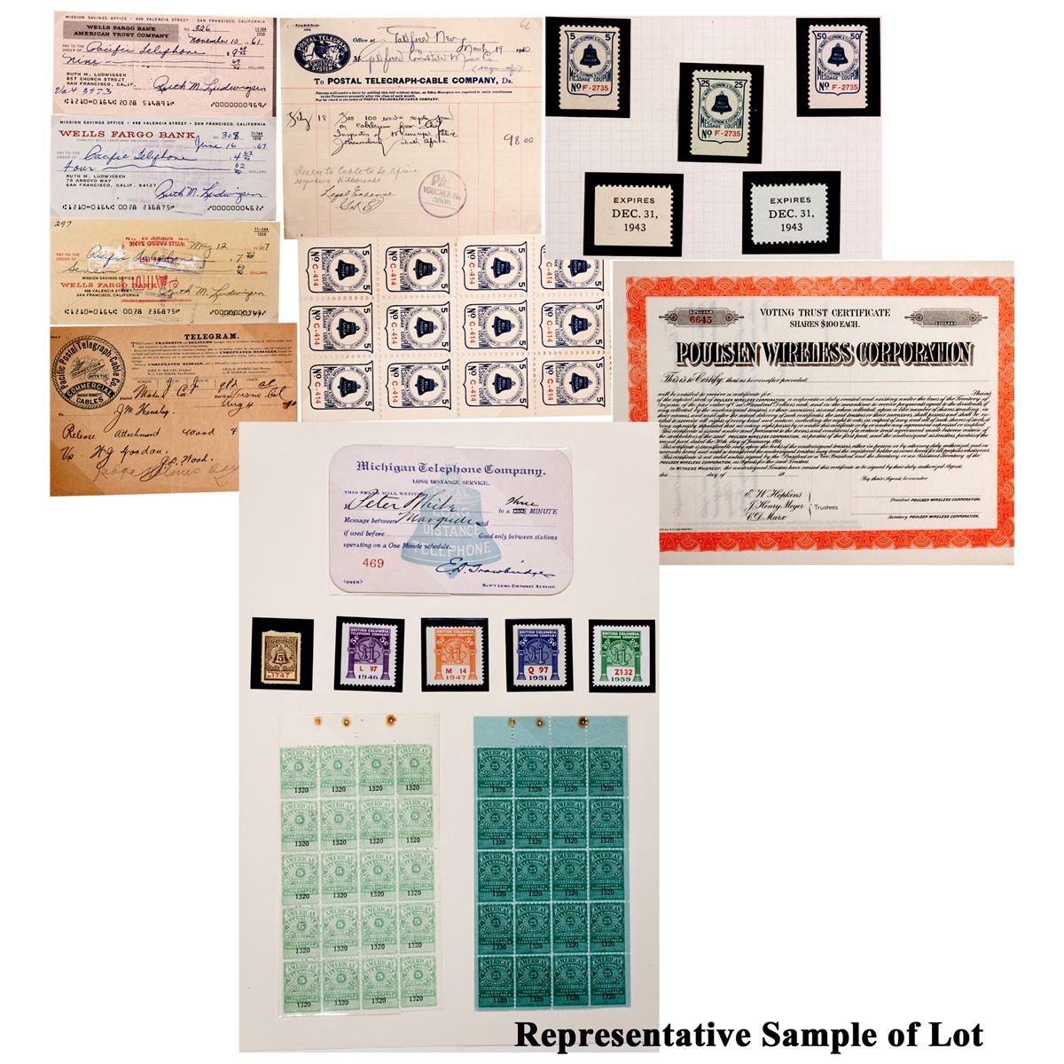 This is Bill Weber's Telephone and Telegraph document collection. It is a major collection, mostly nineteenth century, comprised of several parts: Philatelic (State Telegraph Stamps); Documents (many early Western and American telegraphs); paper tokens and much research information from his files. This major collection has some great highlights that include documents from: Cal. Electric Works (1888), Gold & Stock Telegraph (1879), American Wireless T&T prospectus (1899), Ariz Telegraph Co (1896), St. Louis (1848), Atlantic & Ohio Telegraph (1863), Atlantic & Pacific Telegraph, California State Telegraph (plus stamps), Connecticut River Telegraph, Franklin Telegraph, Nevada and California Telegraph and much more. Included are many "pass style" cards for phone and telegraph companies. The great majority of the more than 100 piece collection are the adhesive stamps. Please inspect. Contained in two notebooks. - Weber Collection