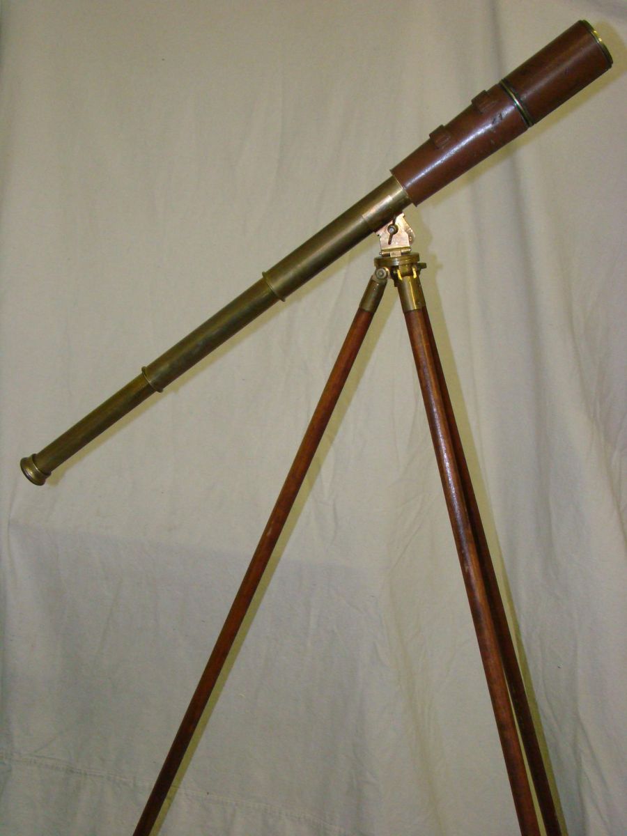 A Scout Regiment 3 Draw Telescope by HCR & Son Ltd. End segment is marked "Tel Sig MK VI also GS" Under the company name it is also marked "8405" and "OS717GA. Scope measures 33 inches long when extended, not including sunshade. Leather casing is intact but missing the End Caps. Optics appear to operate fine and clear. Comes with a wood and brass Tri-pod, that may not be original issue. Legs measure 60 inches long.