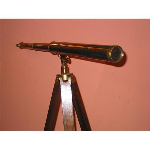 English brass two drawer telescope on original oak and brass tripod. Good optics. 62ins high. Removable from tripod c.1880