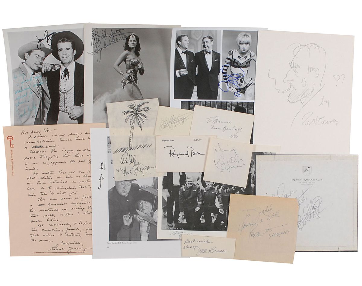 Collection of 15 items consisting of photos, signatures, a couple of sketches, and a letter, each from a different television actor or actress, with inscriptions added to most of the items. Signers are: Kirk Alyn, Joe Besser, Raymond Burr, Art Carney, Lynda Carter, Iron Eyes Cody, Joe DeRita, Redd Foxx, James Garner and Jack Kelly, Alan Hale, Jr., Phil Hartman, Goldie Hawn, Bob Hope, Gene Roddenberry, and Robert Young. In very good to fine overall condition.