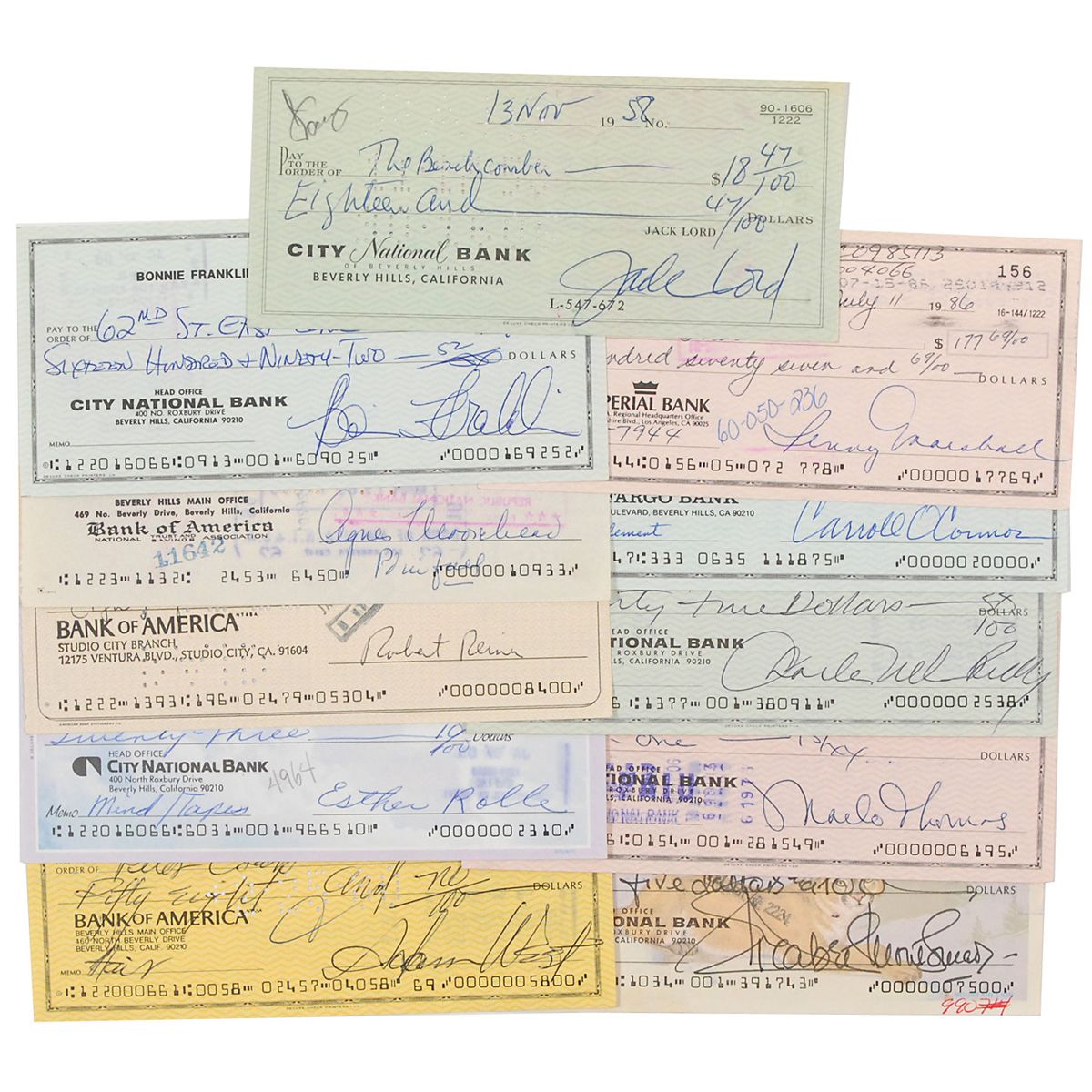 Collection of 11 personal and bank checks, each signed by a different television actor or actress. Signers are: Adam West, Marlo Thomas, Esther Rolle, Charles Nelson Reilly, Rob Reiner, Carroll O’Connor, Agnes Moorehead, Penny Marshall, Bonnie Franklin, Jack Lord, and Elizabeth Montgomery. In very good condition, with expected stamps and holes and a few vertical folds.