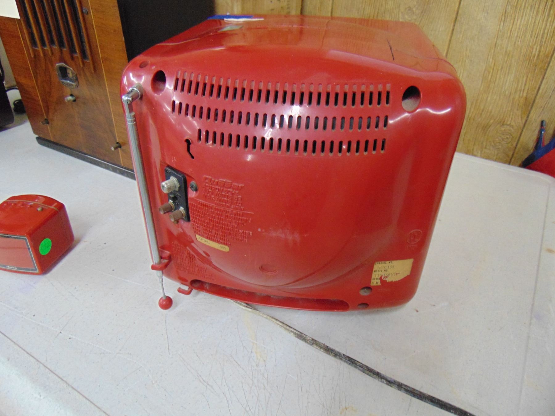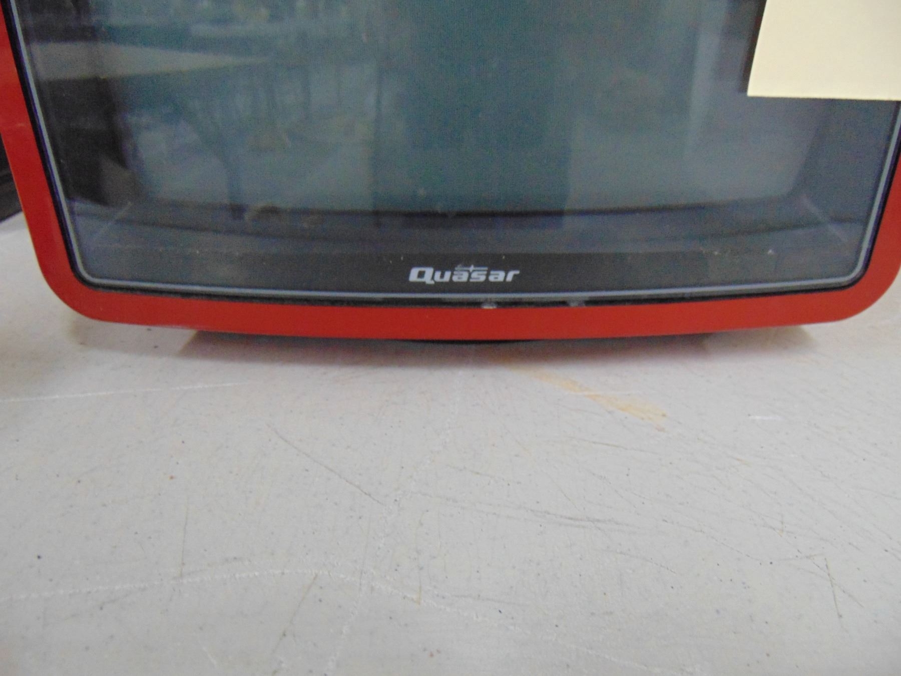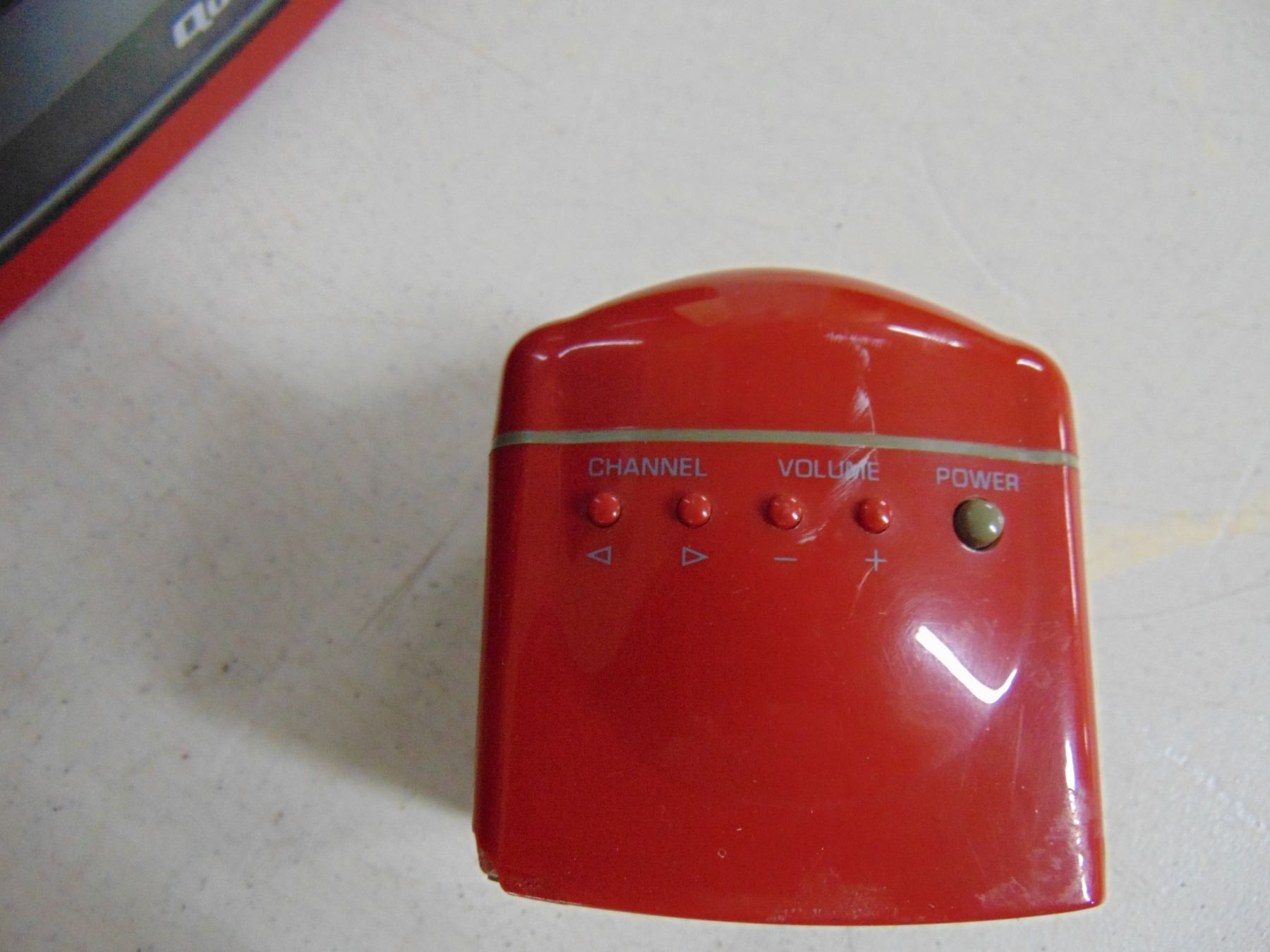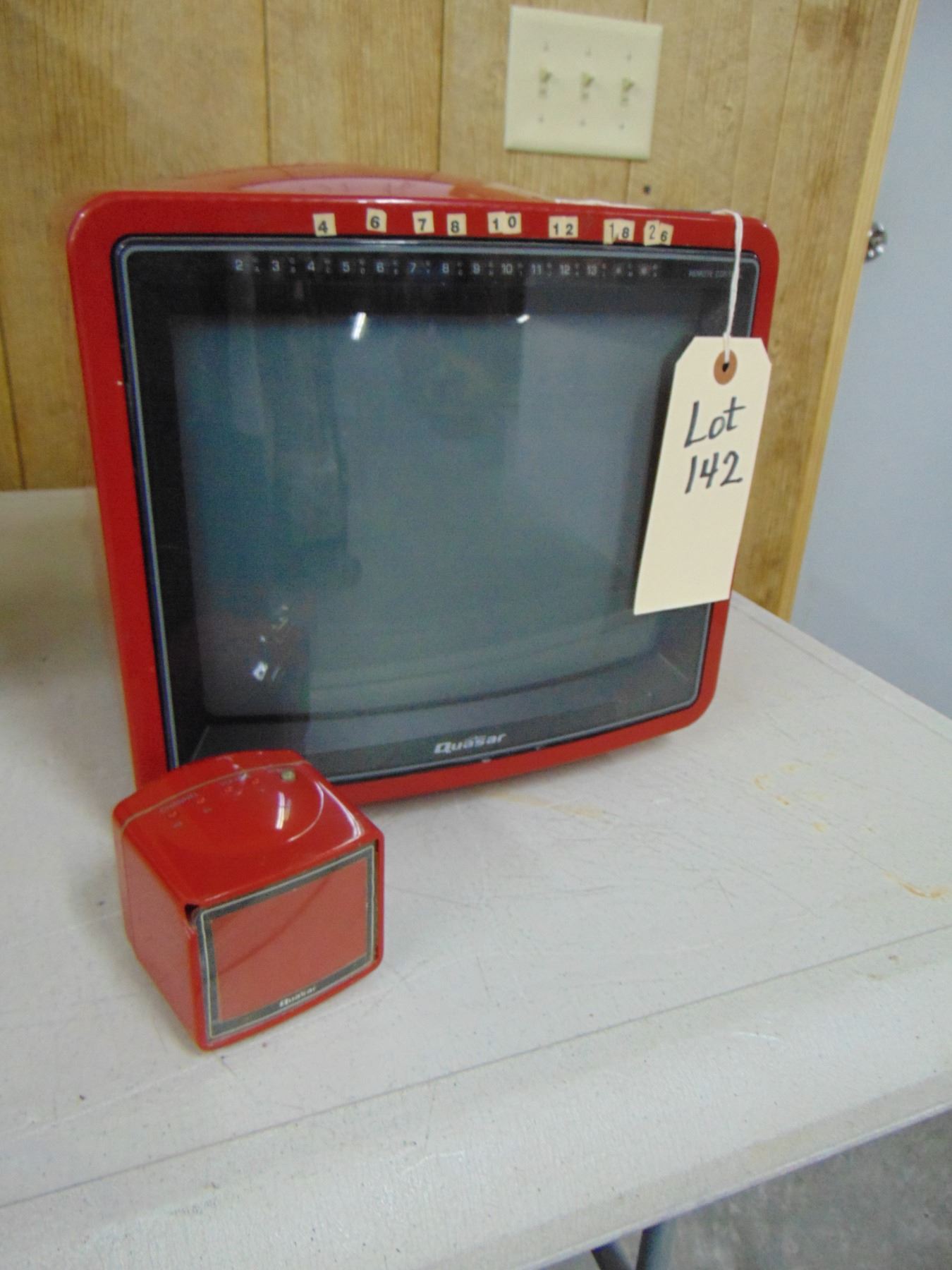 Quasar red portable television; model TP 8156YR; bright picture tube and good raster; with matching remote ( has small chip in corner); very cute!!