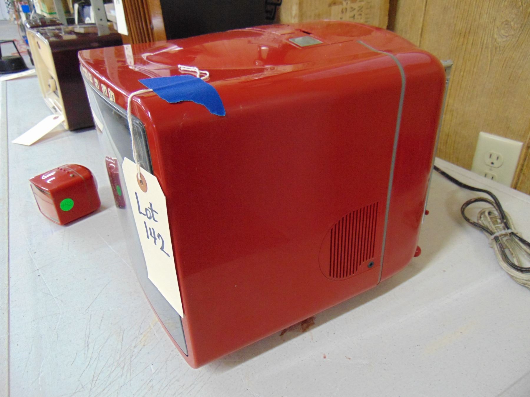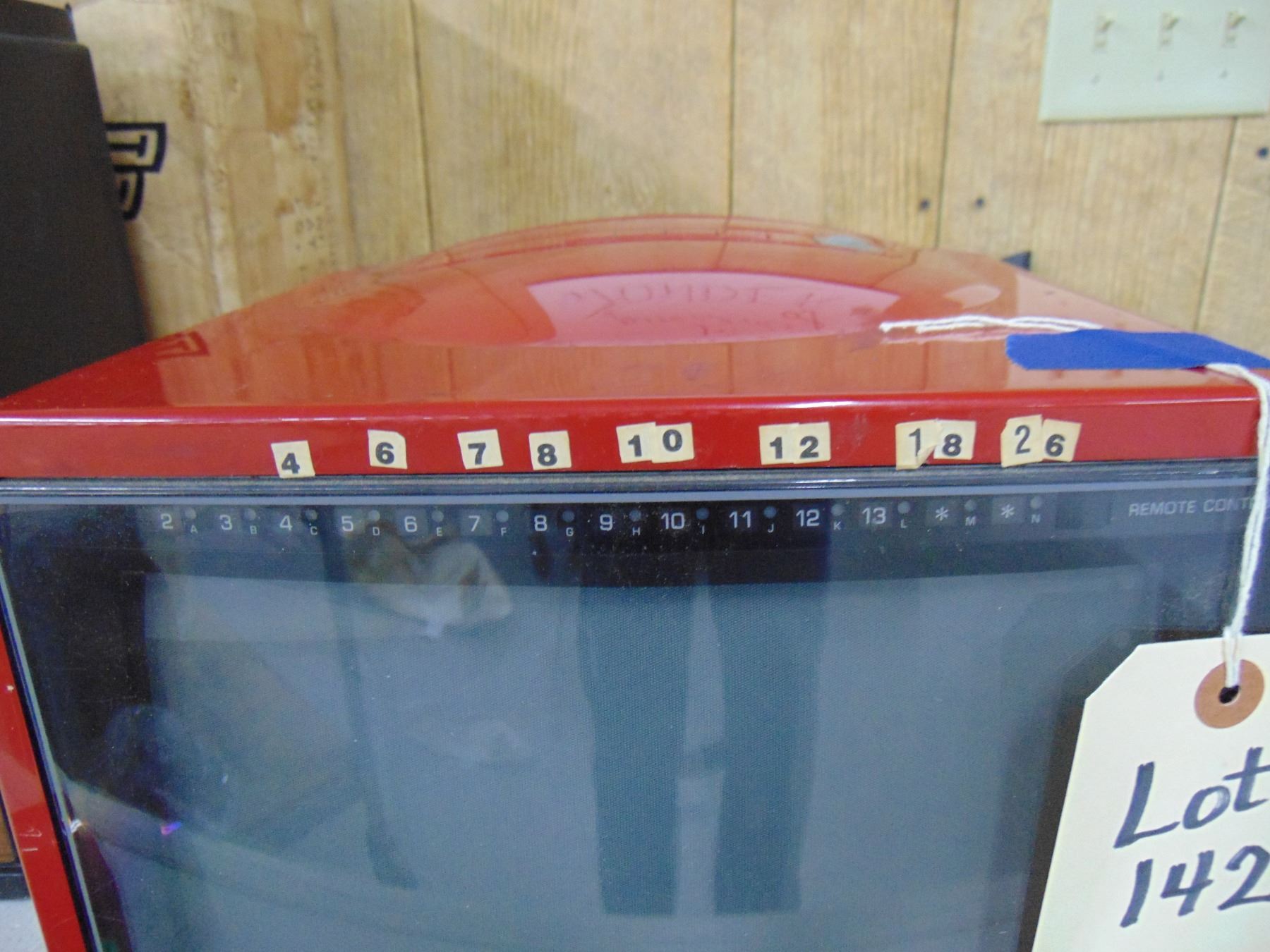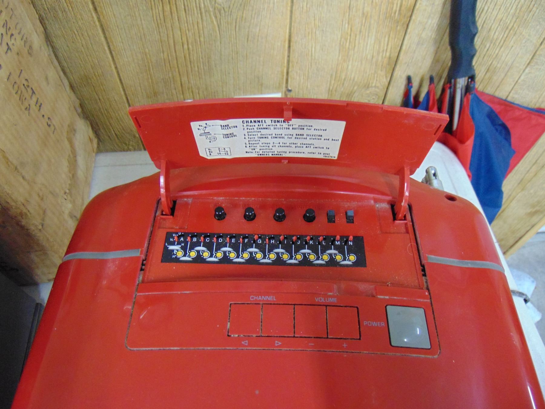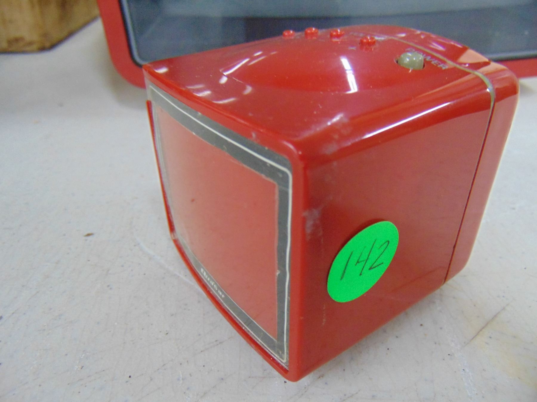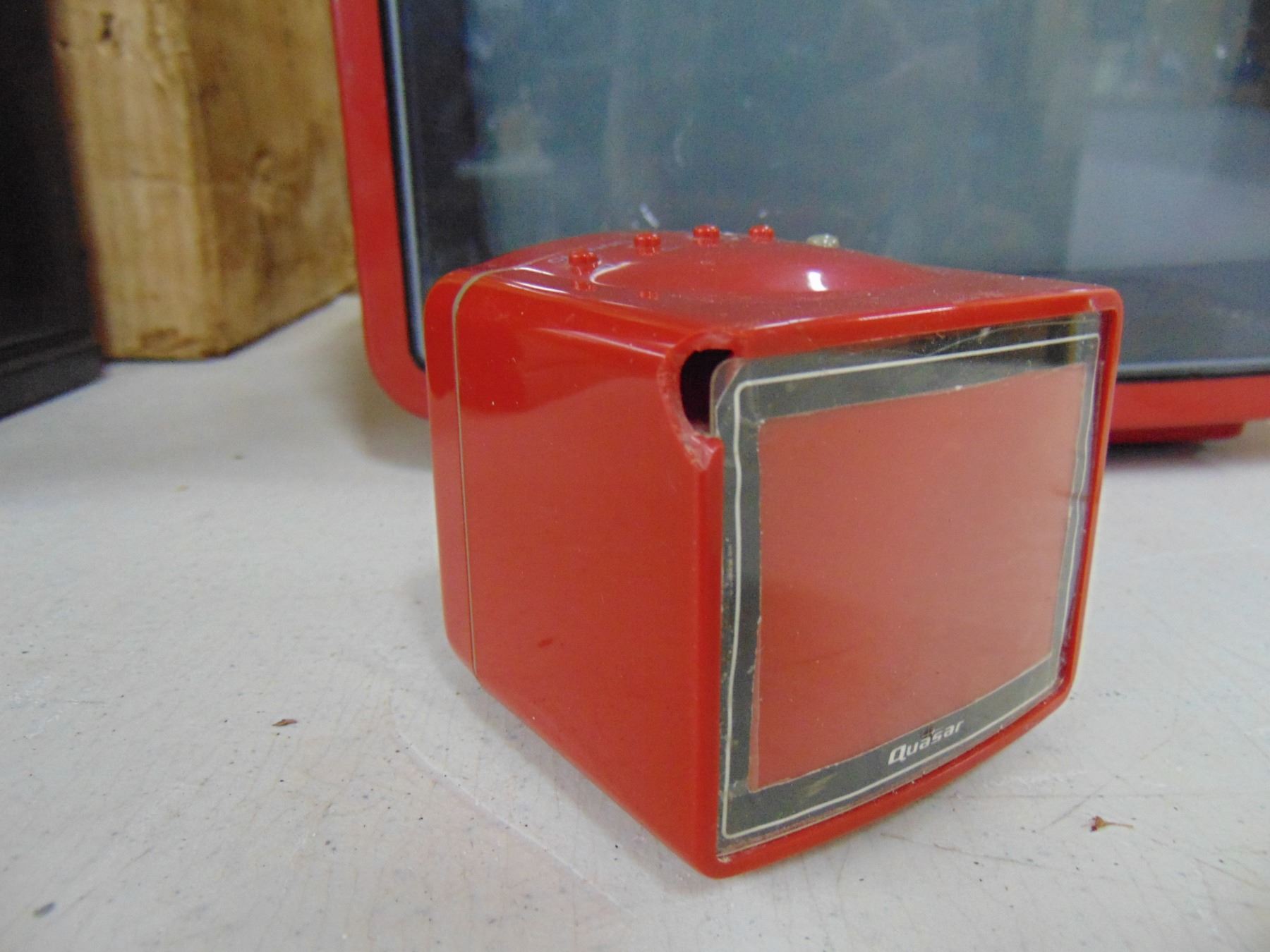 Quasar red portable television; model TP 8156YR; bright picture tube and good raster; with matching remote ( has small chip in corner); very cute!!