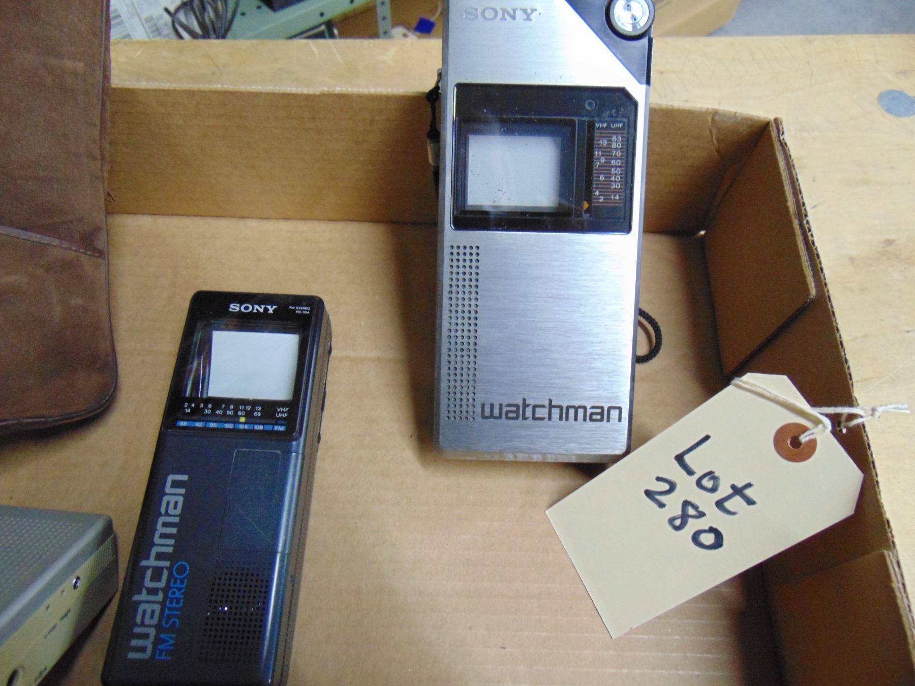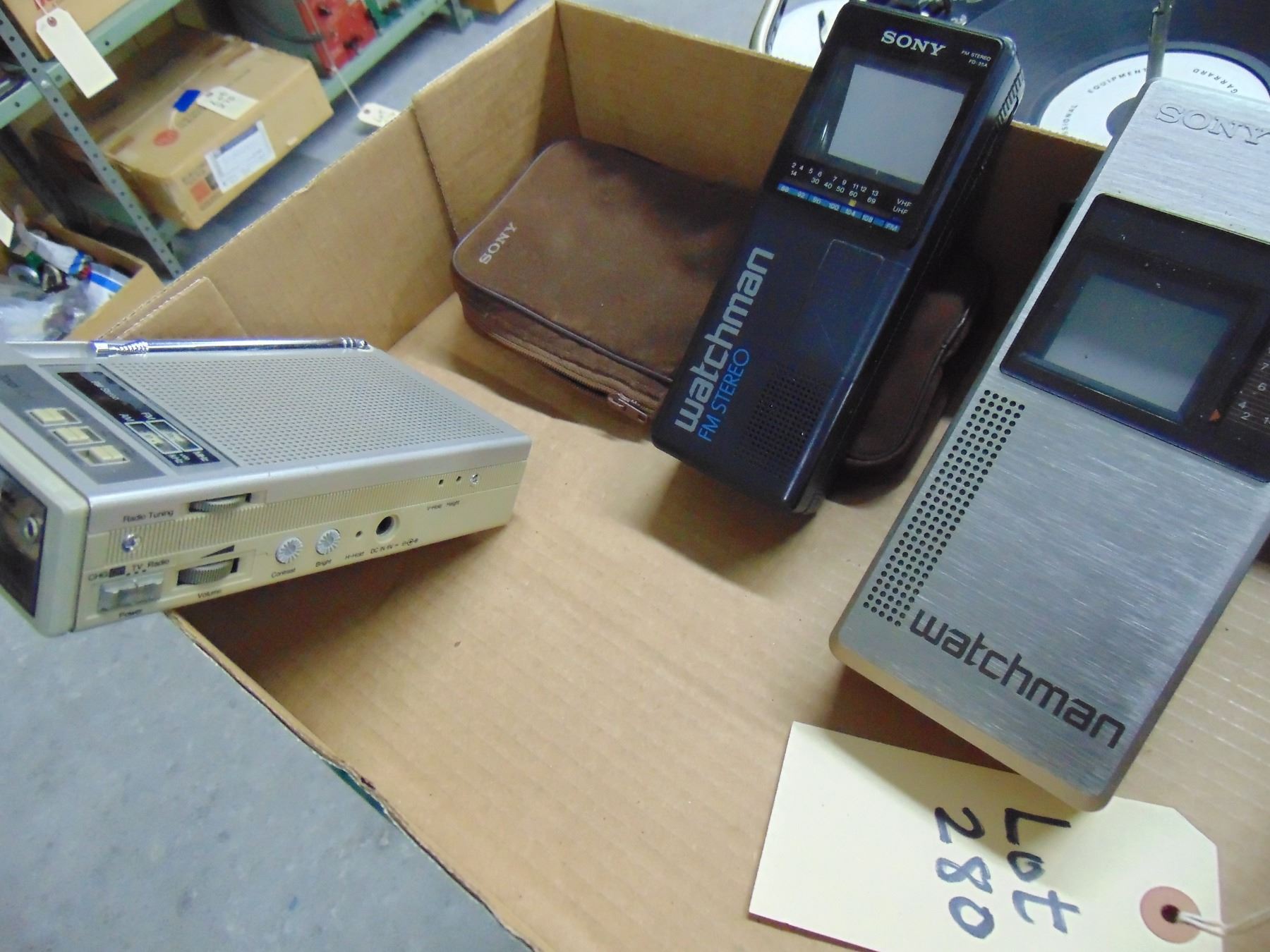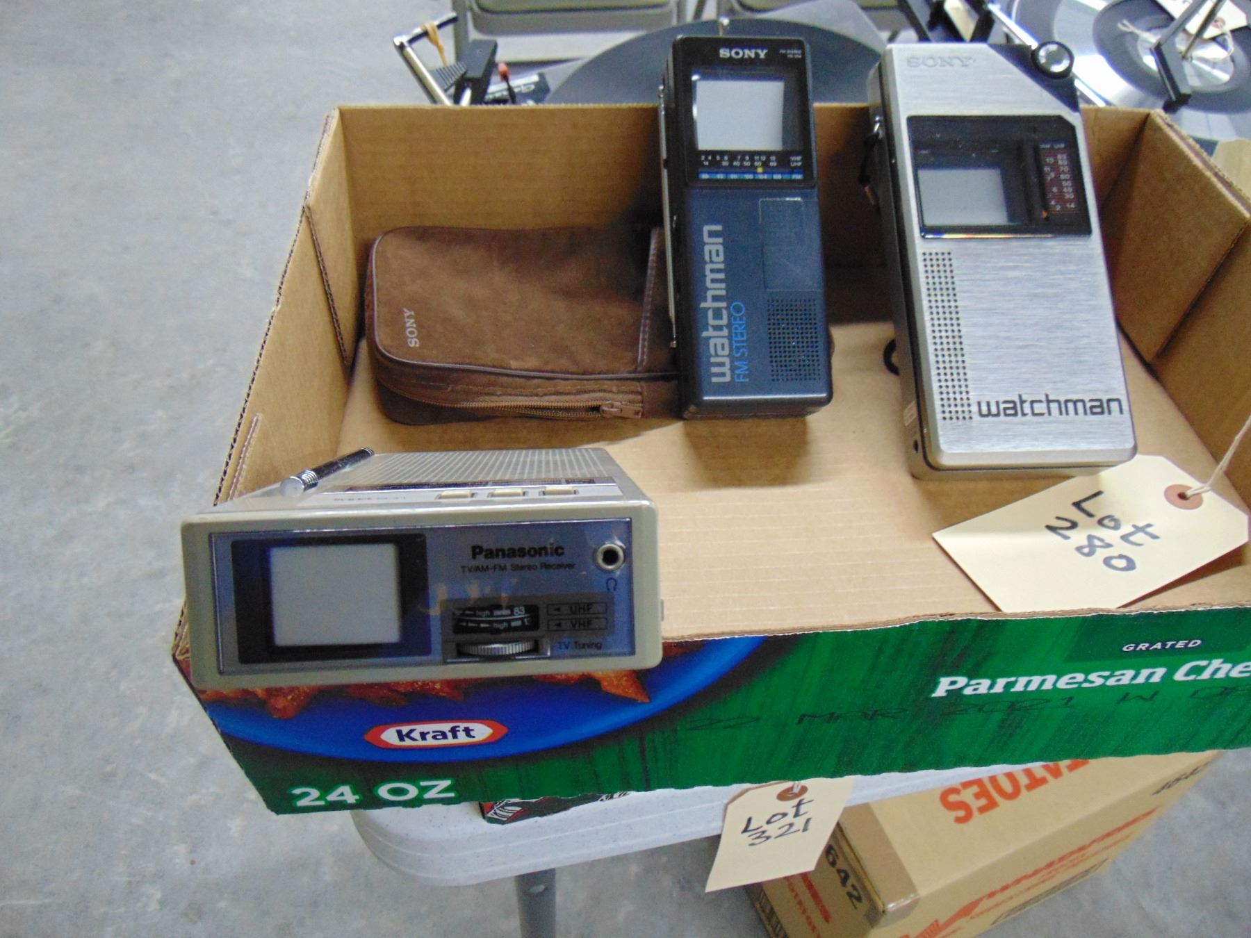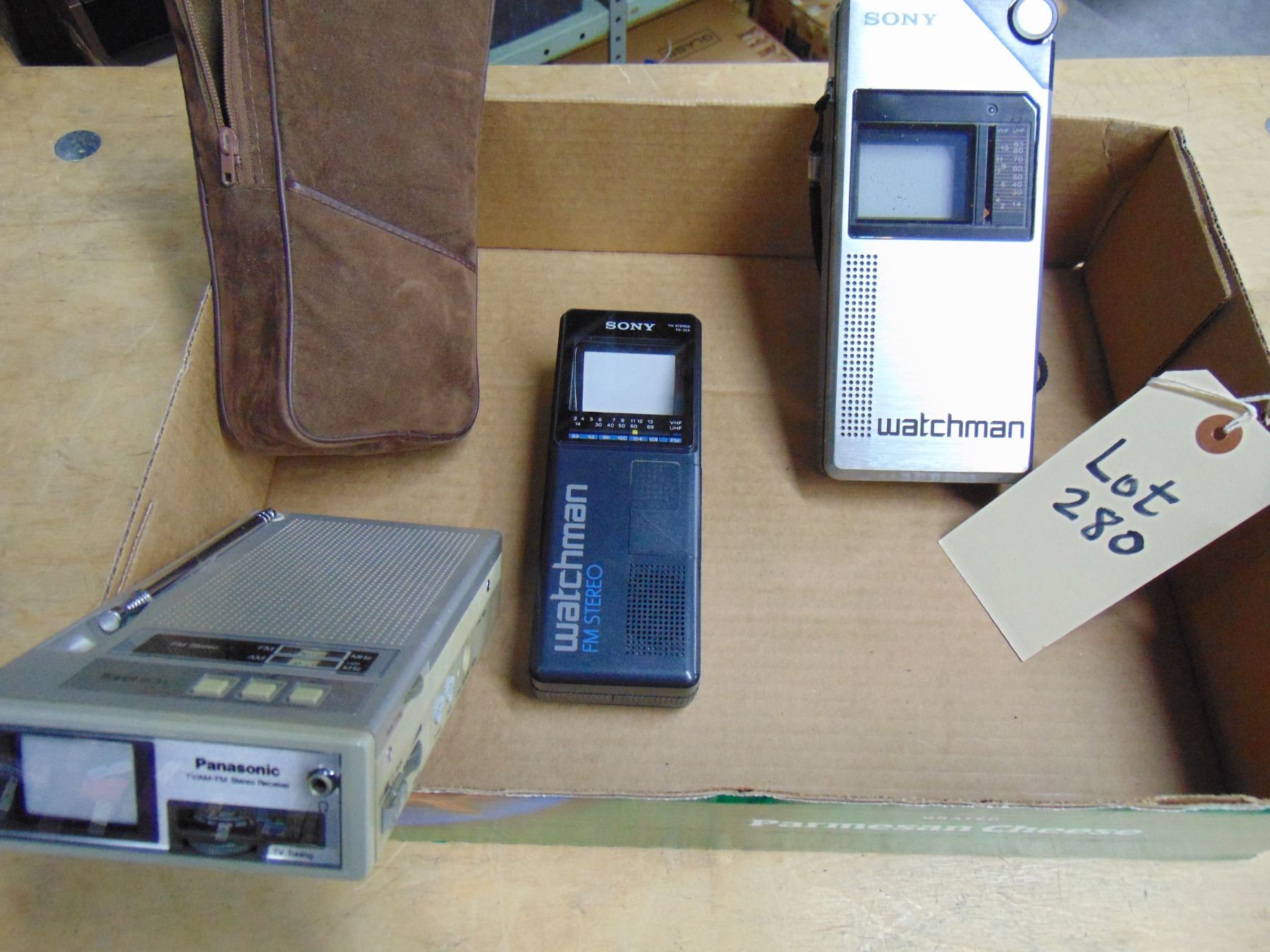 3 small televisions; Sony Watchman, model FD-210, black and white; Sony Watchman, model FD-35A, tv/fm; Panasonic travelvision, model TR-1020PA, tv/am/fm