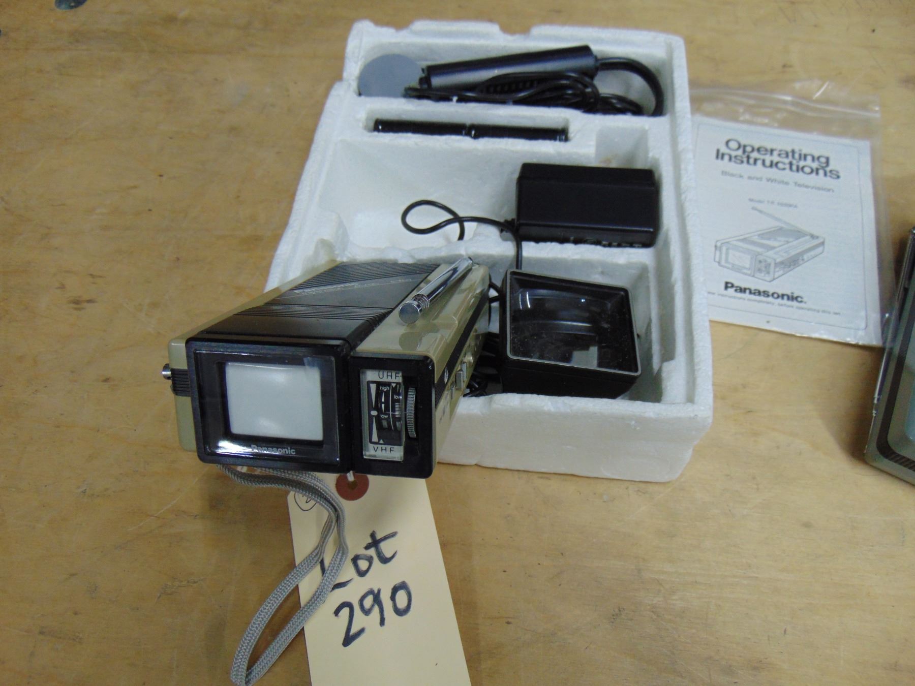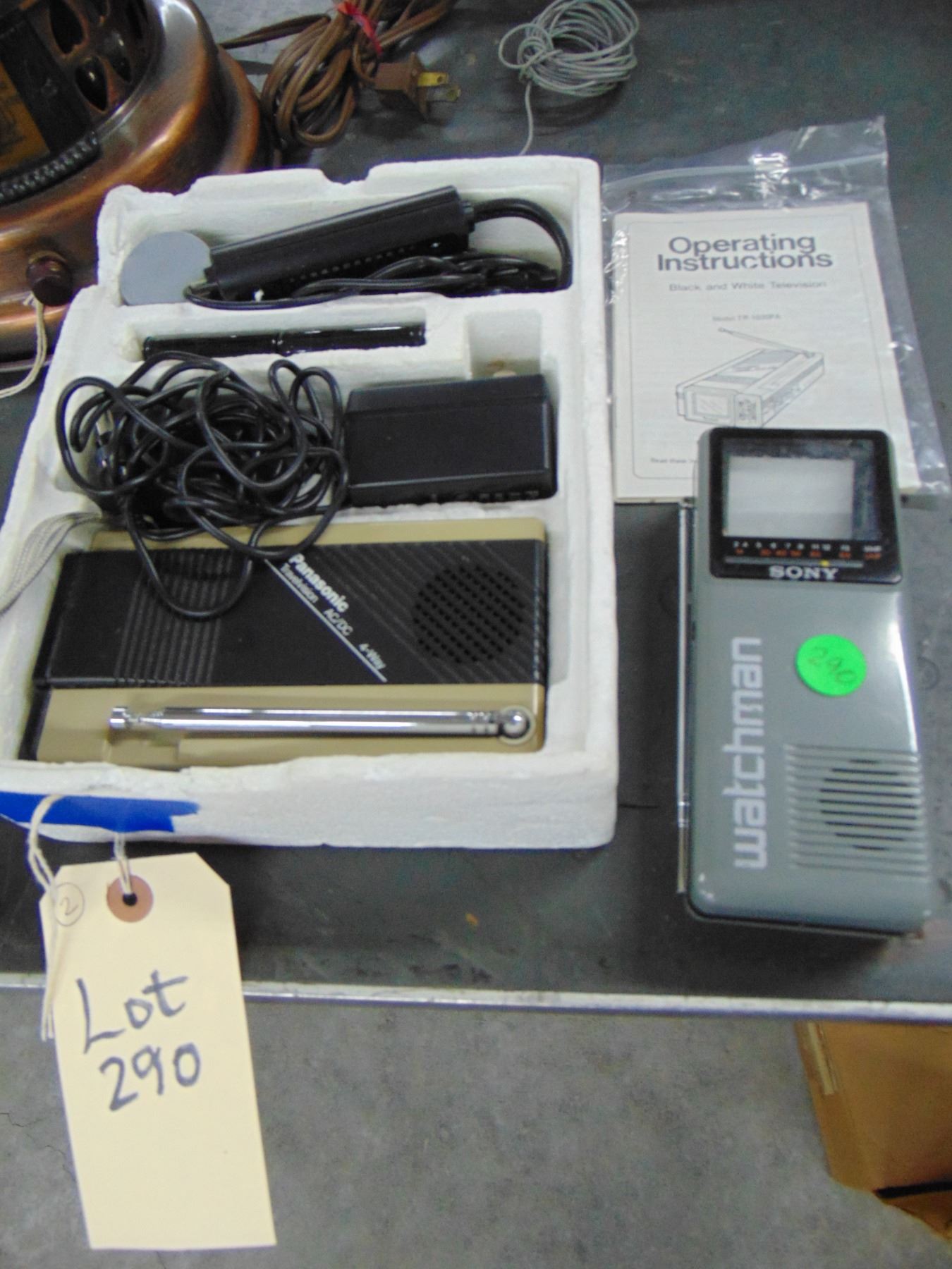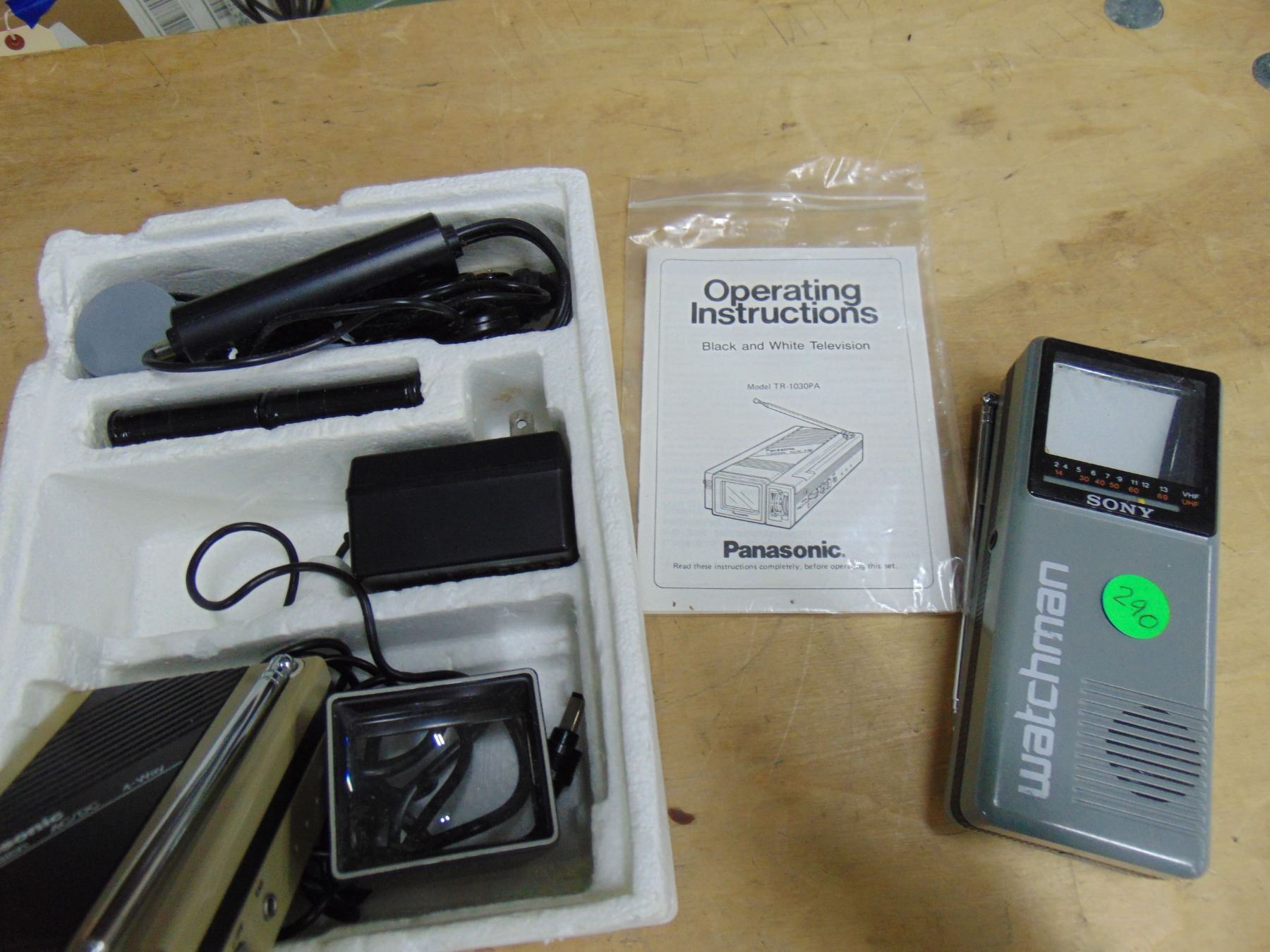 2 small televisions; Sony Watchman, model FD-10A, black and white; Panasonic Travelvision, model TR-1039A, includes manual, electric cord, magnifier