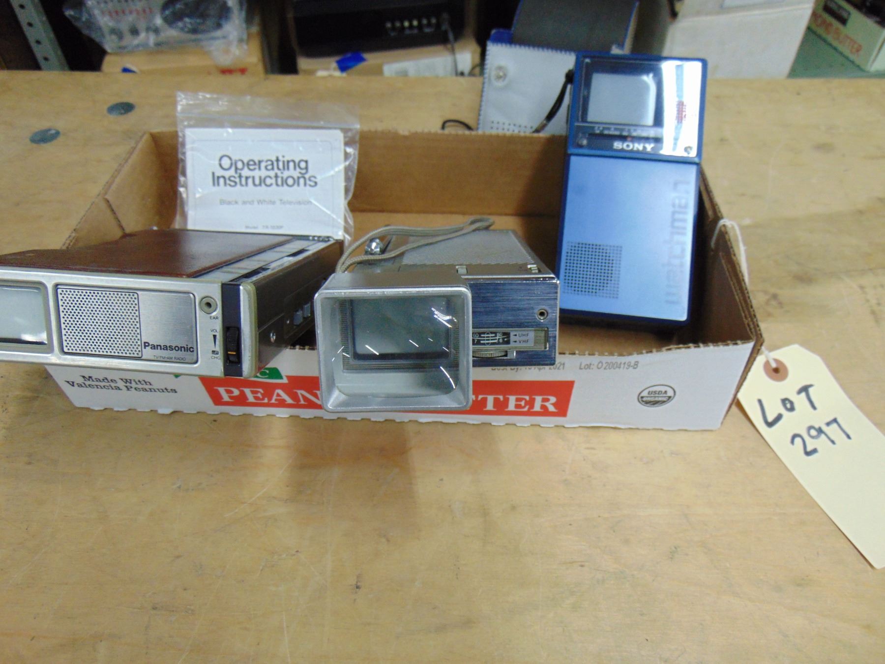 3 small televisions; Sony Watchman, blue, model FD20-A, with case; Panasonic tv, model TR-1010P, with magnifier; Panasonic tv/am/fm