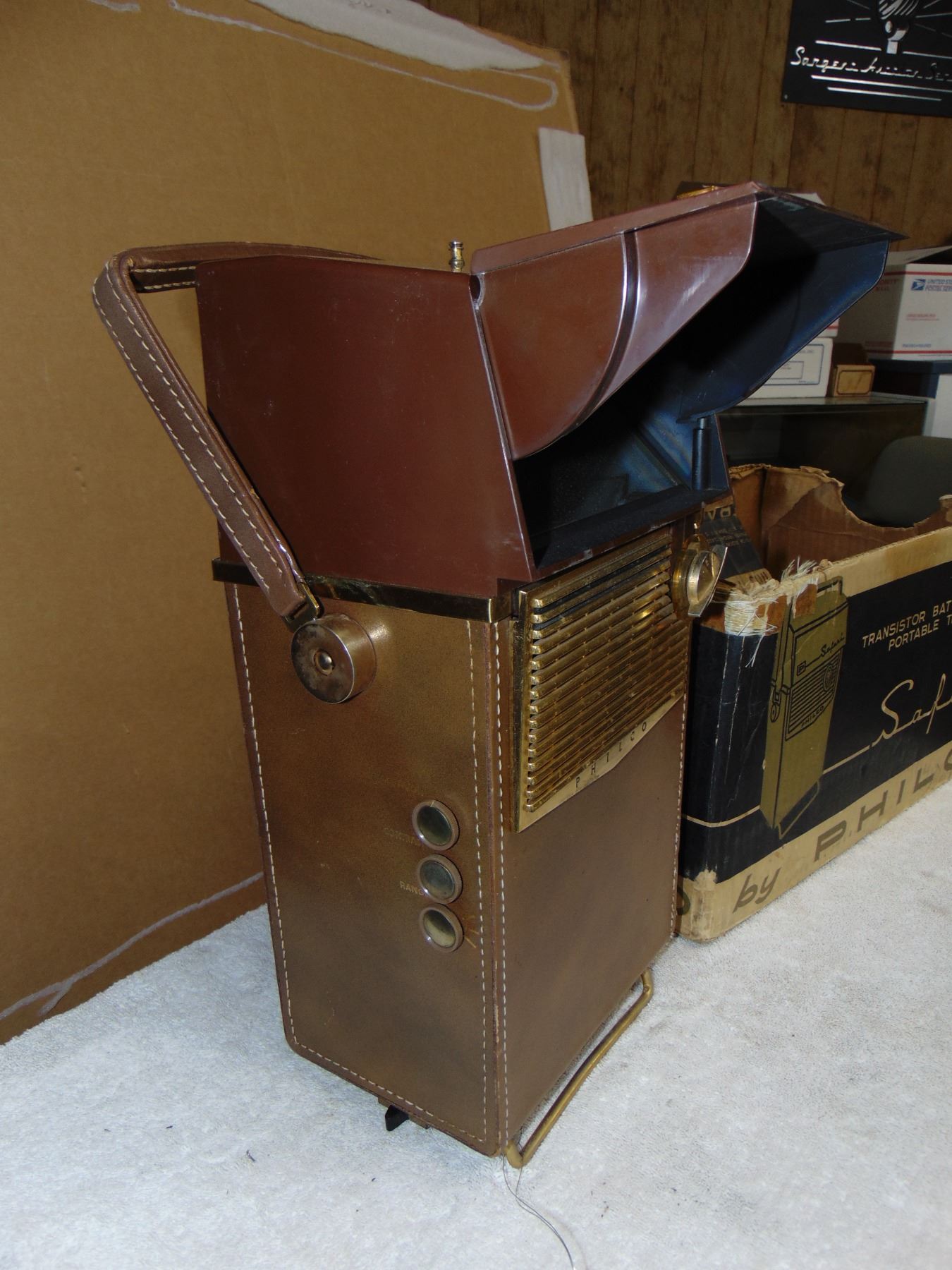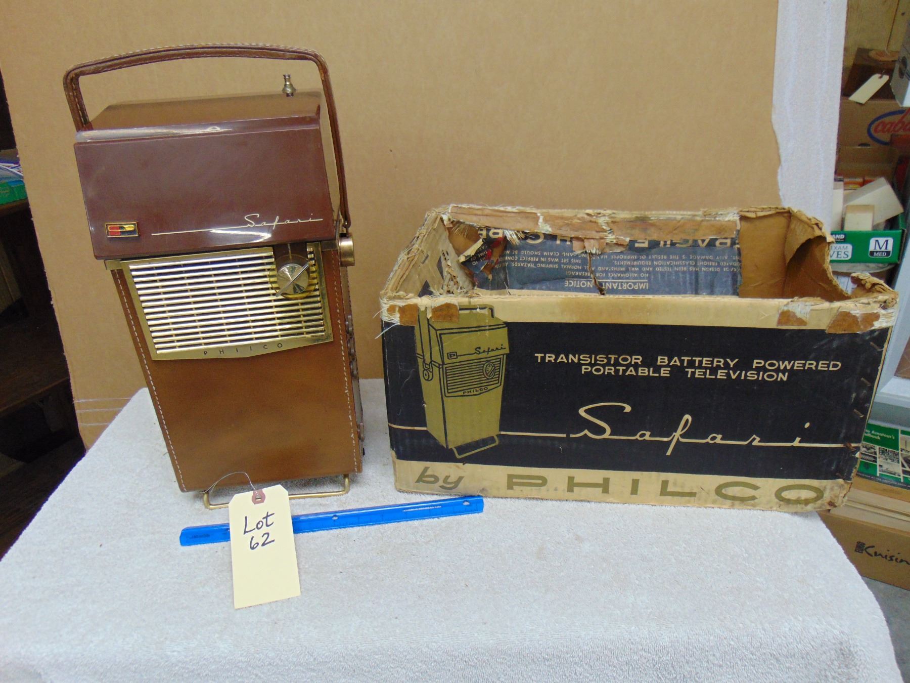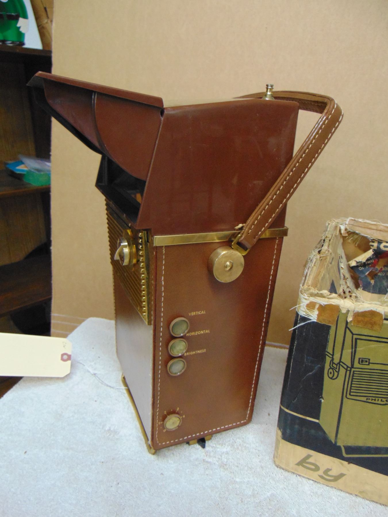 Philco Safari portable tv; Philco's first transistor television; excellent brown leather; original box; no power cord