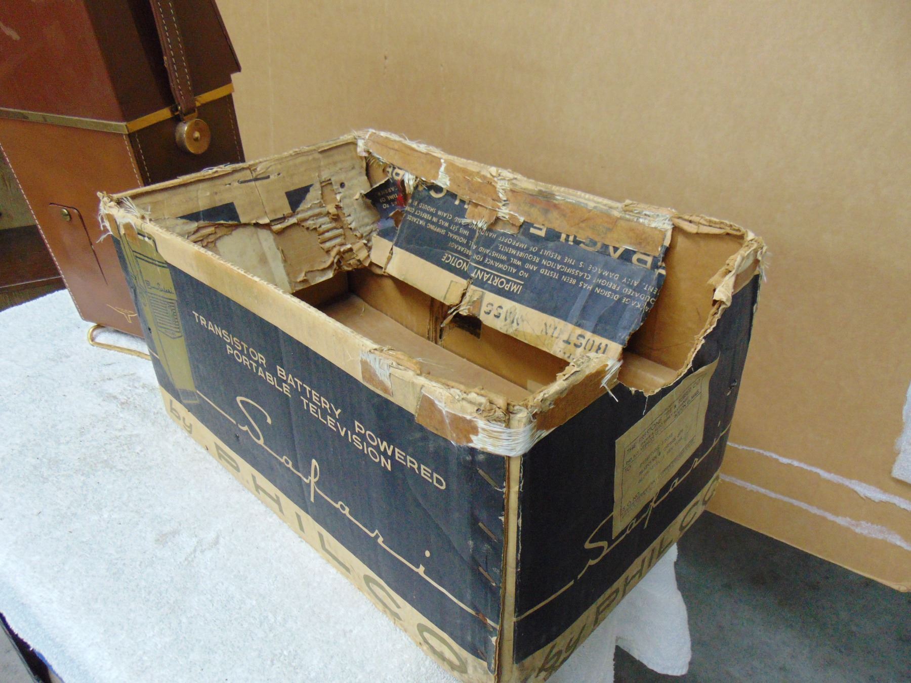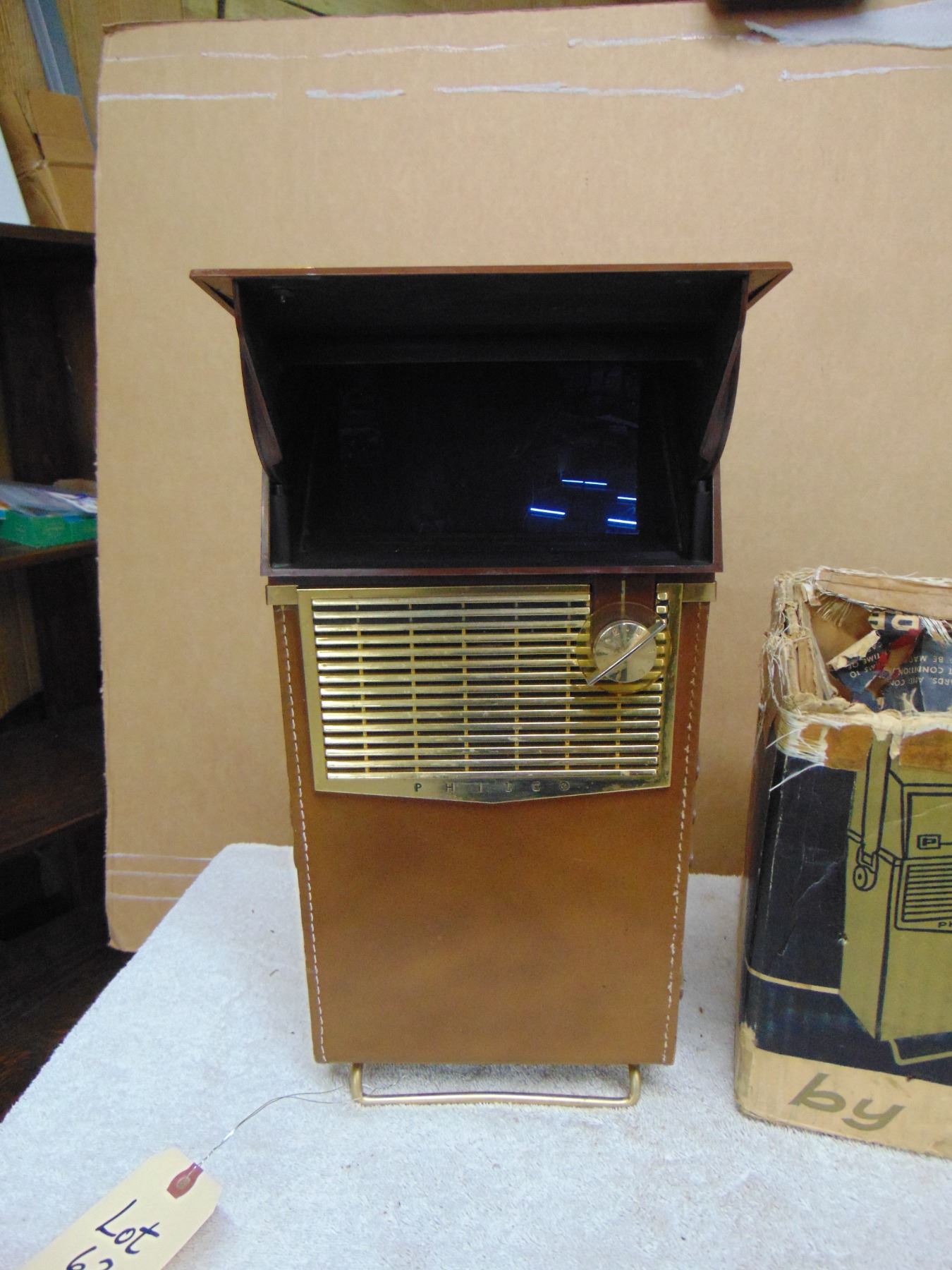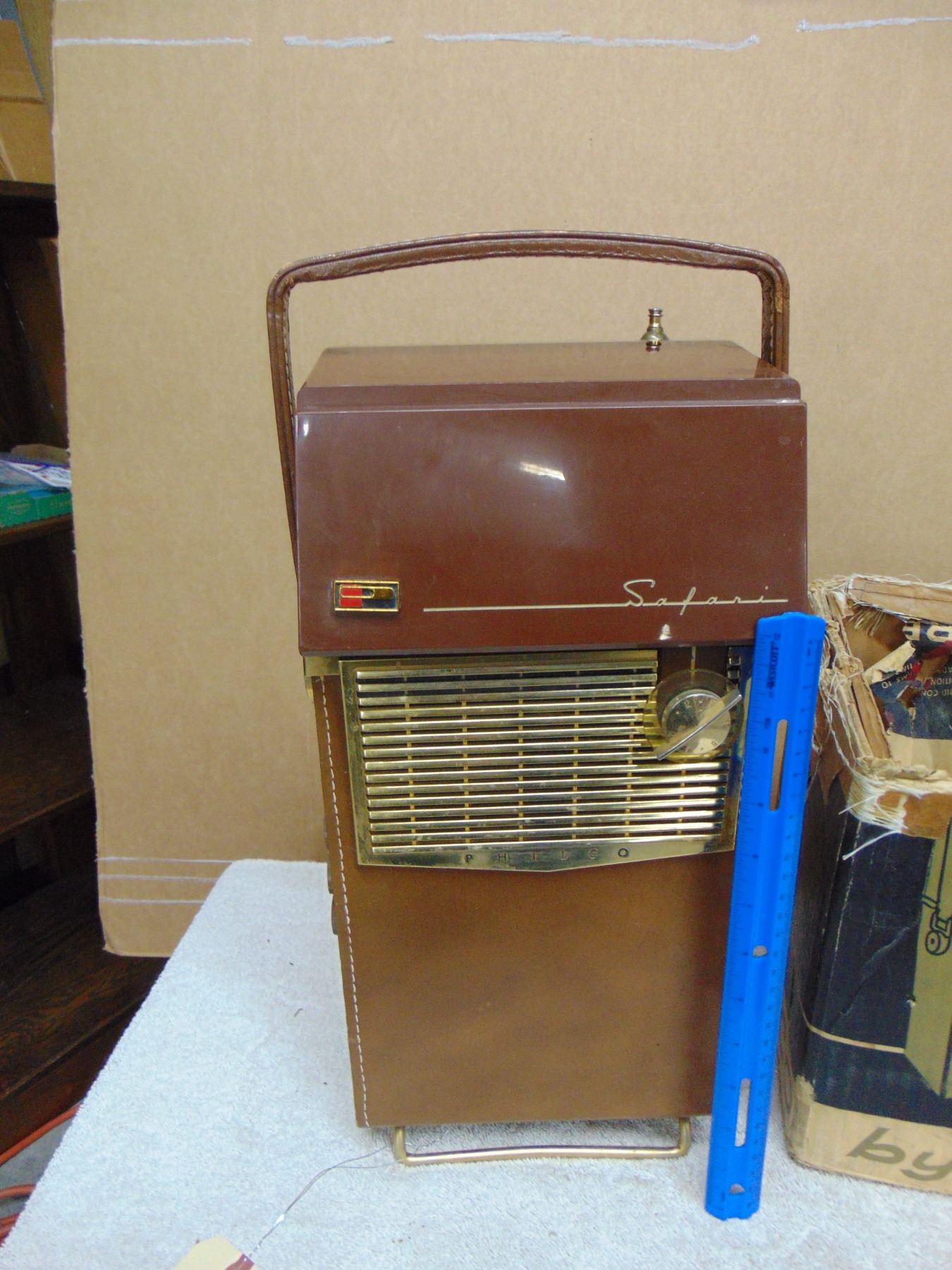 Philco Safari portable tv; Philco's first transistor television; excellent brown leather; original box; no power cord